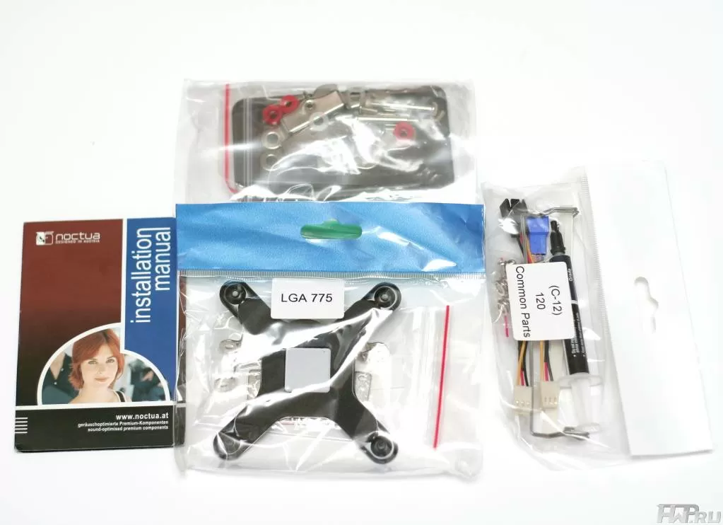 Аксессуары внутри коробки были разложены по отдельным упаковкам с названием платформ, для которых они предназначены. Кроме крепежа в отдельном пакетике была найдена высокопроизводительная фирменная термопаста NT-H1, инструкция, силиконовые полоски с клейкой стороной, две крепежные скобы для крепления вентилятора и два переходника для снижения его оборотов.