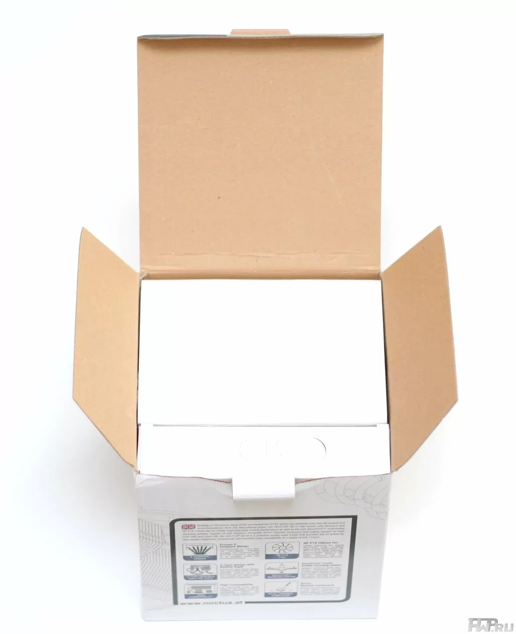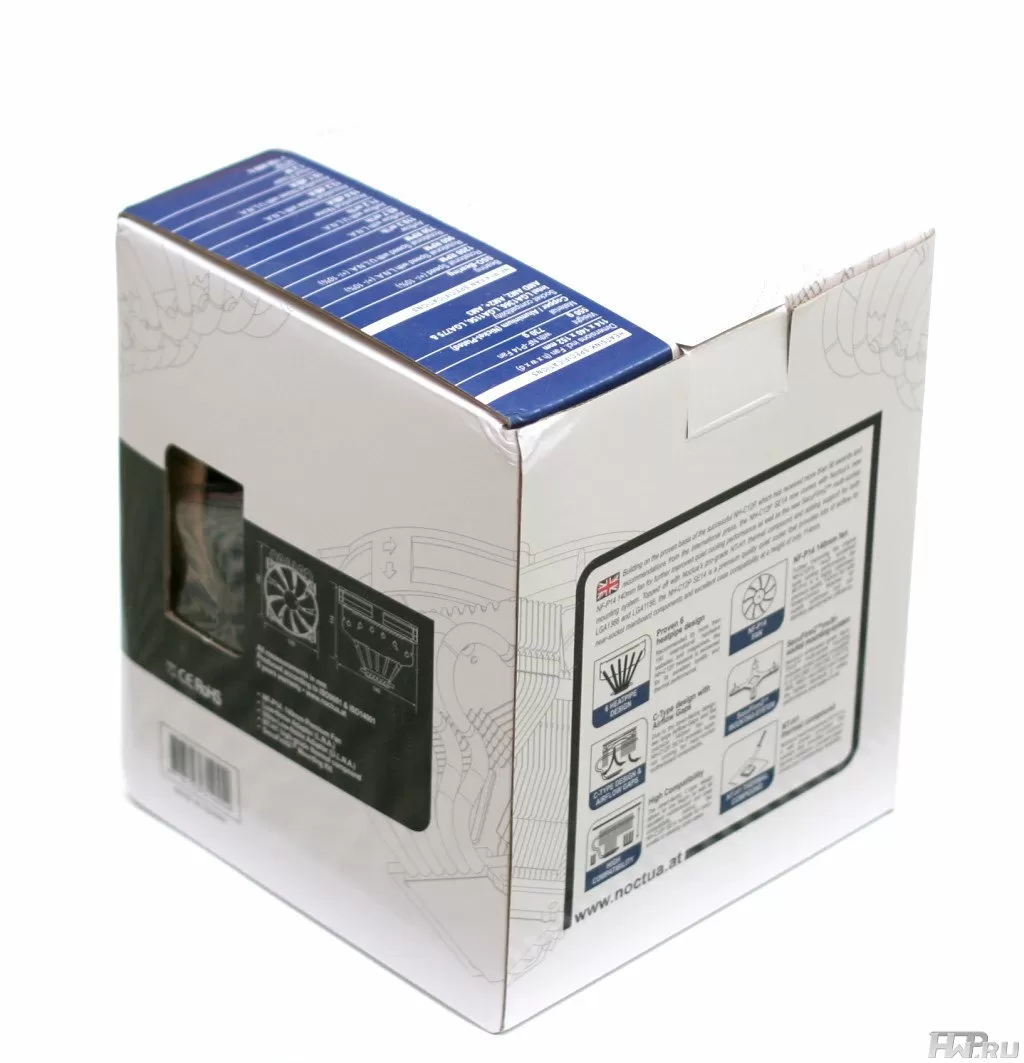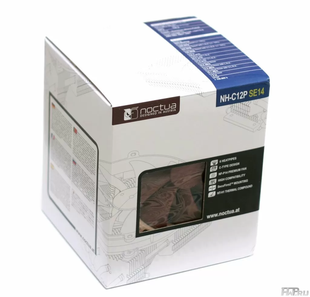 Вместо привычного для Noctua коричнево-синего дизайна, на коробке NH-C12P SE14 мы видим преобладание белого цвета, что не даст спутать старую и новую версии кулеров (правда прозрачные окошки с двух сторон все-таки остались в обоих вариантах).
