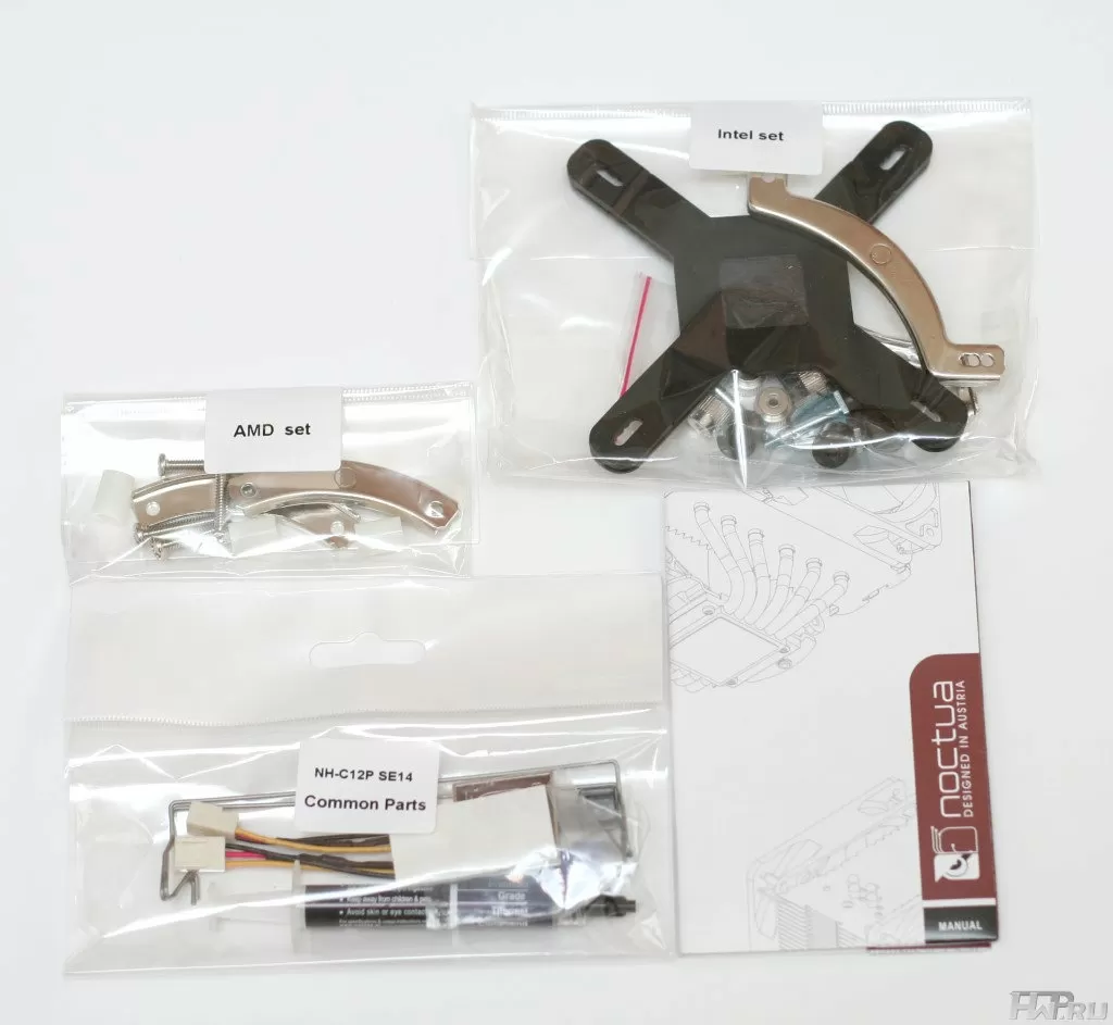 Количество аксессуаров практически не изменилось. Они как всегда заботливо упакованы в отдельные пакетики с названием платформ. Кроме крепежа кулера в наборе аксессуаров находится всем уже известная фирменная термопаста NT-H1, инструкция, четыре демпферные полоски с клейкой стороной из силикона, две крепежные скобы для крепления вентилятора и три переходника для изменения оборотов вентилятора.
