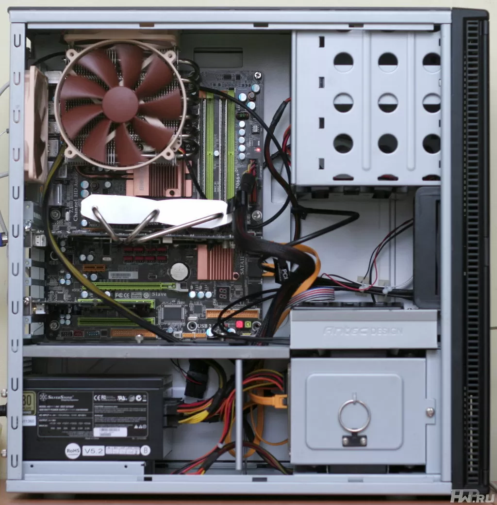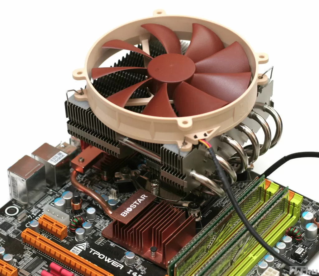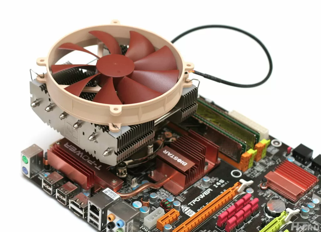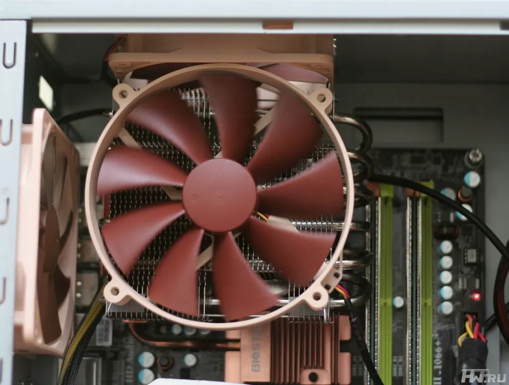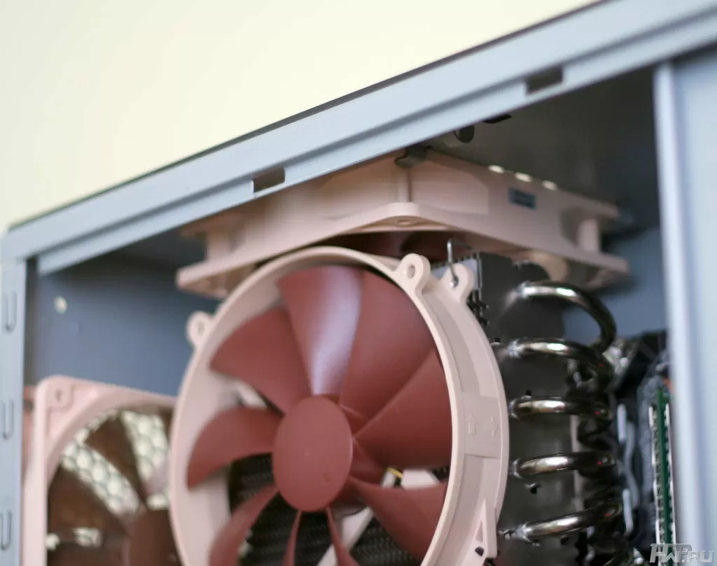 При установке в корпус мы увидели, как выпирающие части вентилятора очень неудачно уперлись в верхний корпусной вентилятор. Правда стоит констатировать тот факт, что данное соприкосновение нисколько не мешало лопастям корпусного вентилятора выполнять свою работу, а значит в данной ситуации нет ничего страшного. Пользователям с не очень вместительным шасси все же стоит задуматься и расчитать все размеры перед покупкой.