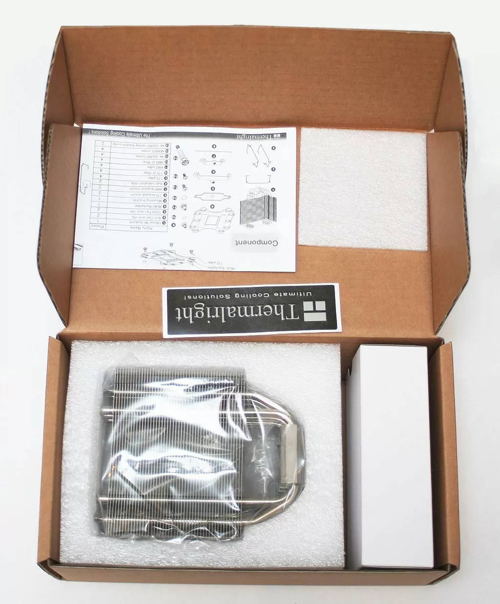 Открыв упаковку можно увидеть хорошо упакованный радиатор в полиэтиленовом пакете. Также рядом находится коробка с крепежными частями, инструкция по установке и наклейка с логотипом Thermalright.
