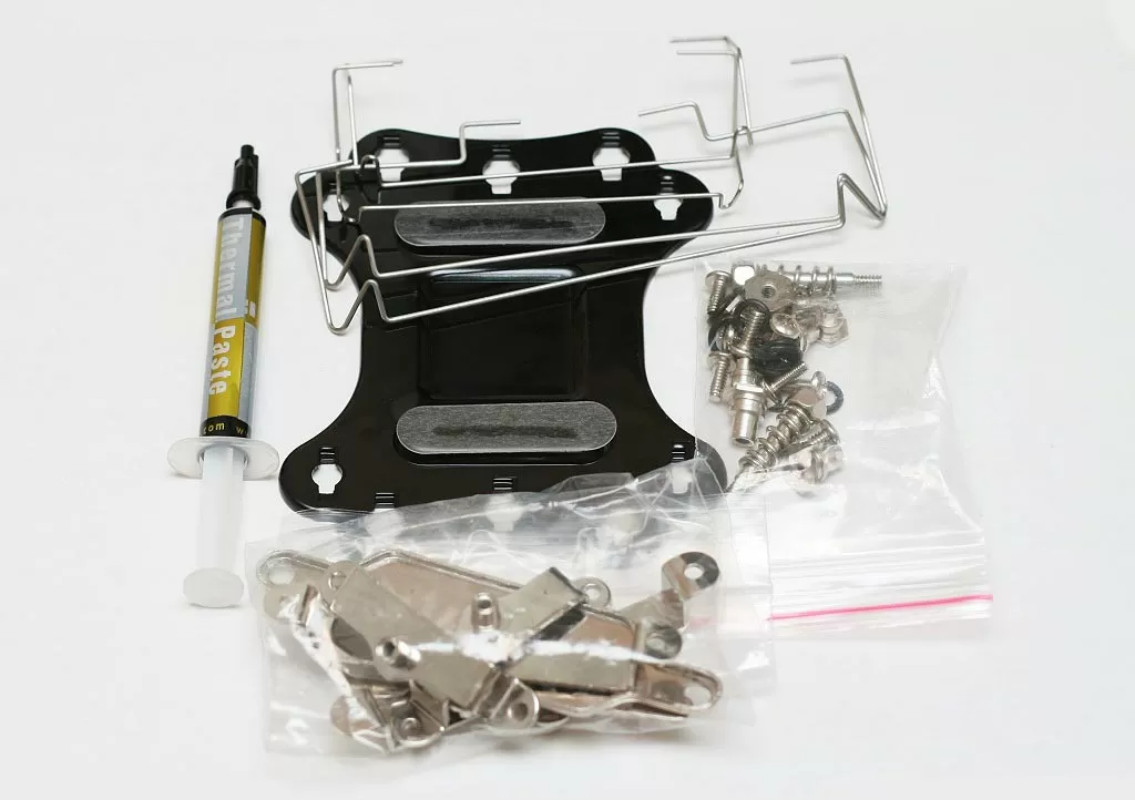 В коробке нашлось место для тюбика с термопастой, креплений для сокетов AM2 и LGA775, антивибрационных прокладок, крепежных болтов и четырех железных рамок для крепления вентиляторов разных размеров. Как можно заметить, в комплекте отсутствует фирменный вентилятор. Thermalright оставляет право в выборе охлаждающего устройства для Ultima-90 за покупателем. Важно отметить, что на радиатор устанавливаются как 90мм вентиляторы, так и 120мм, при помощи тех самых четырёх железных рамок, обнаруженных в комплекте. Такую поддержку разных размеров определенно можно отнести к плюсам продукта, так как у потенциального покупателя открывается большой выбор в поисках нужной модели.