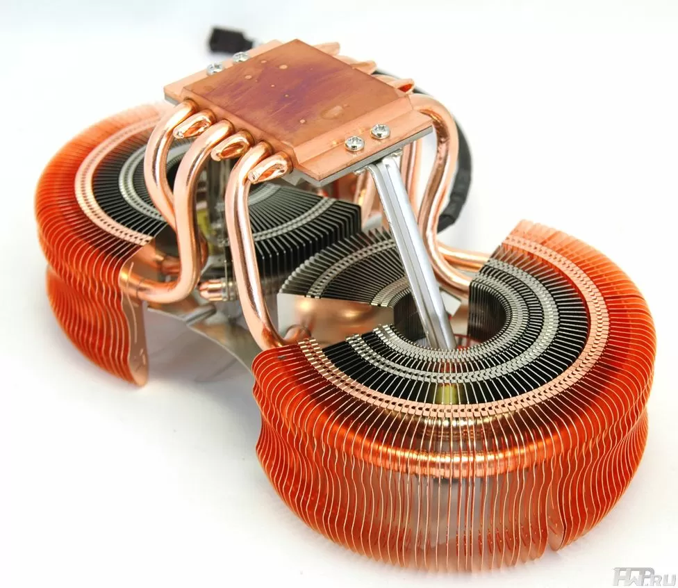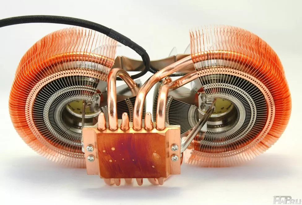 Радиатор использует целых шесть тепловых трубок, изогнутых очень хитрым способом. Когда глядишь на такое творение, то просто не верится, что можно так изогнуть трубку и при этом насадить на неё ребра.