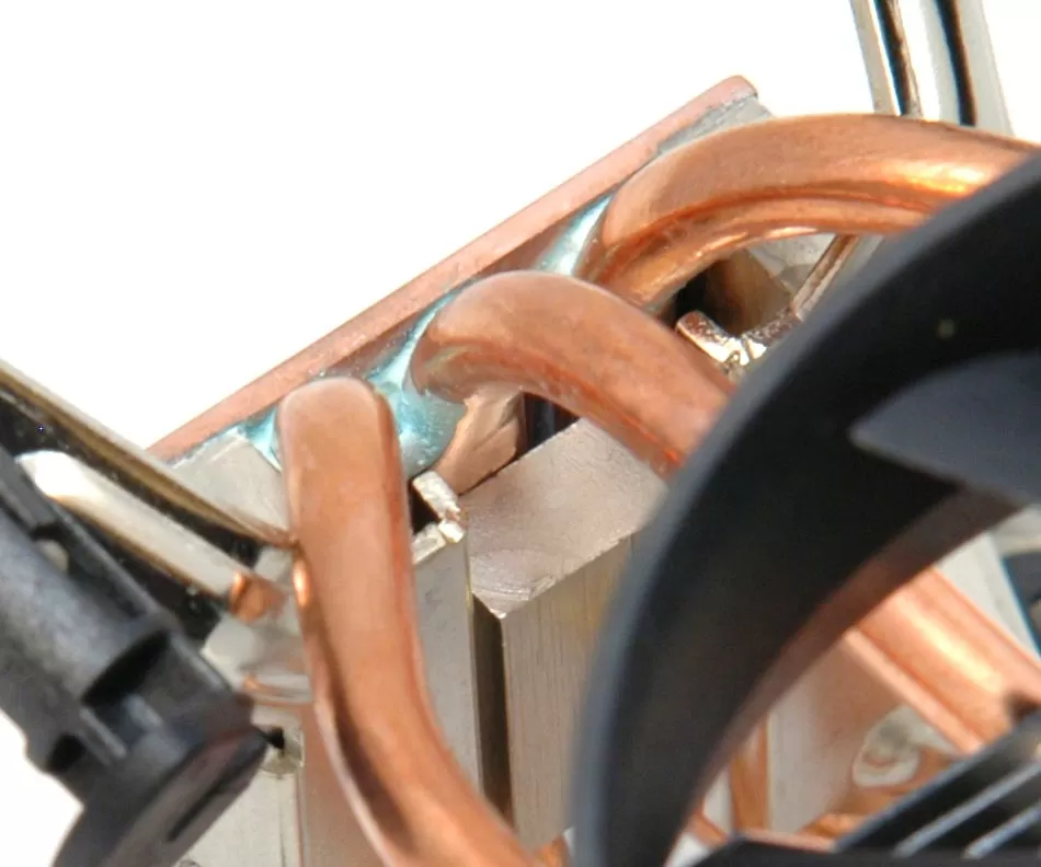 Обратите внимание, насколько тонкая здесь медная пластинка подошвы - это способствует более эффективному отводу тепла от ядра процессора. Так же интересно, что трубки приварены только к самой медной подошве, а в местах, где трубки, изгибаясь, уже поднимаются над медной пластинкой, они промазаны каким-то составом, очевидно для увеличения площади контакта трубок с подошвой.