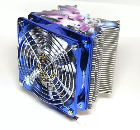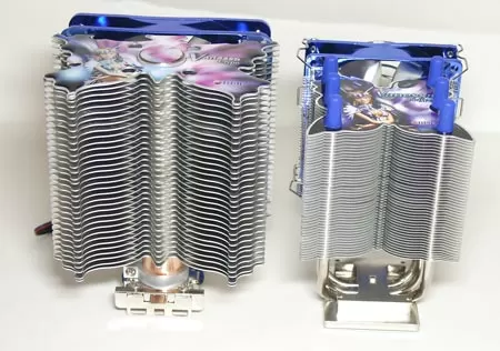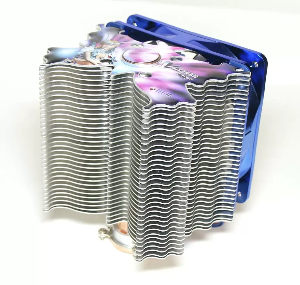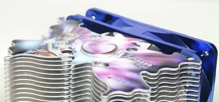 Кулер Titan Vanessa L-Type имеет составной радиатор с плоскими алюминиевыми пластинами. Правда, толщина этих пластин достаточно большая, минимум в два раза больше, чем у других кулеров аналогичной категории. Но благодаря этому радиатор более крепкий и его рёбра не мнутся во время инсталляции, даже если вы будете крепко сжимать его в руках. Пластины радиатора имеют форму бабочки, а на самой верхней сделана аппликация, придающая кулеру необычную внешность.