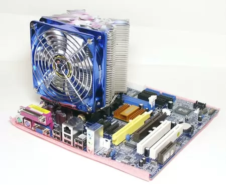 Таким образом, "бабочка" становится как бы проткнутой насквозь толстым медным штырём. Внизу теплопроводящая трубка впрессована в медный пятак основания. Подобная конструкция весьма удачна с той точки зрения, что теплопроводящая трубка имеет большую площадь контакта с основанием и находится прямо над процессорным гнездом. В идеале, конечно, она могла бы касаться самого процессора, но такой радиатор будет очень сложно изготавливать. В общем-то, здесь тепло должно из медного основания переходить прямо в теплопроводящую трубку и распределяться по радиатору.