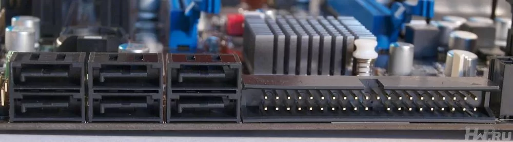 Подобное расположение разъемов идеально: плата компактная, подключить кабели можно даже в тесном корпусе, да и габаритная видеокарта не перекроет доступ к разъемам SATA, как это бывает, когда последние не развернуты параллельно поверхности платы. Так же, параллельно плате расположен и разъем IDE.