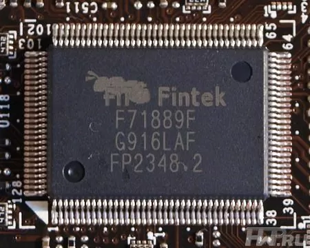 Поддержка FireWire не предусмотрена конструкцией платы – все-таки продукт бюджетный. Раз уж речь зашла о чипах, отметим нечасто применяемый чип мониторинга – Fintek F71889F. С его помощью отслеживаются основные напряжения системы, скорости вращения кулеров, обеспечивается FDD-порт и COM-порт, неизвестно что забывший на задней панели современной материнской платы.