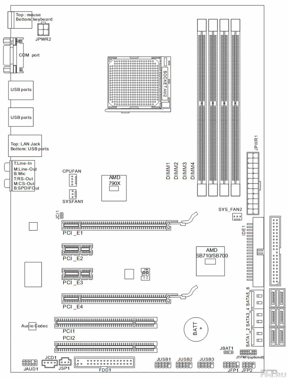 Южный мост SB710 поддерживает 12 портов USB2.0, все они присутствуют на плате. Кроме того, имеется 6 повернутых на 90 градусов портов SATA II с поддержкой RAID 0/1/5/10/JBOD.