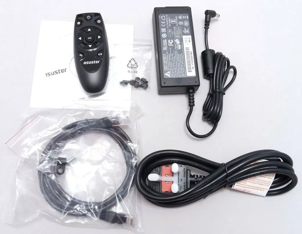 Комплектация привычная, если не считать вышеупомянутый пульт ДУ: блок питания, кабель питания, сетевой кабель, диск с ПО и набор болтиков для установки жестких дисков.