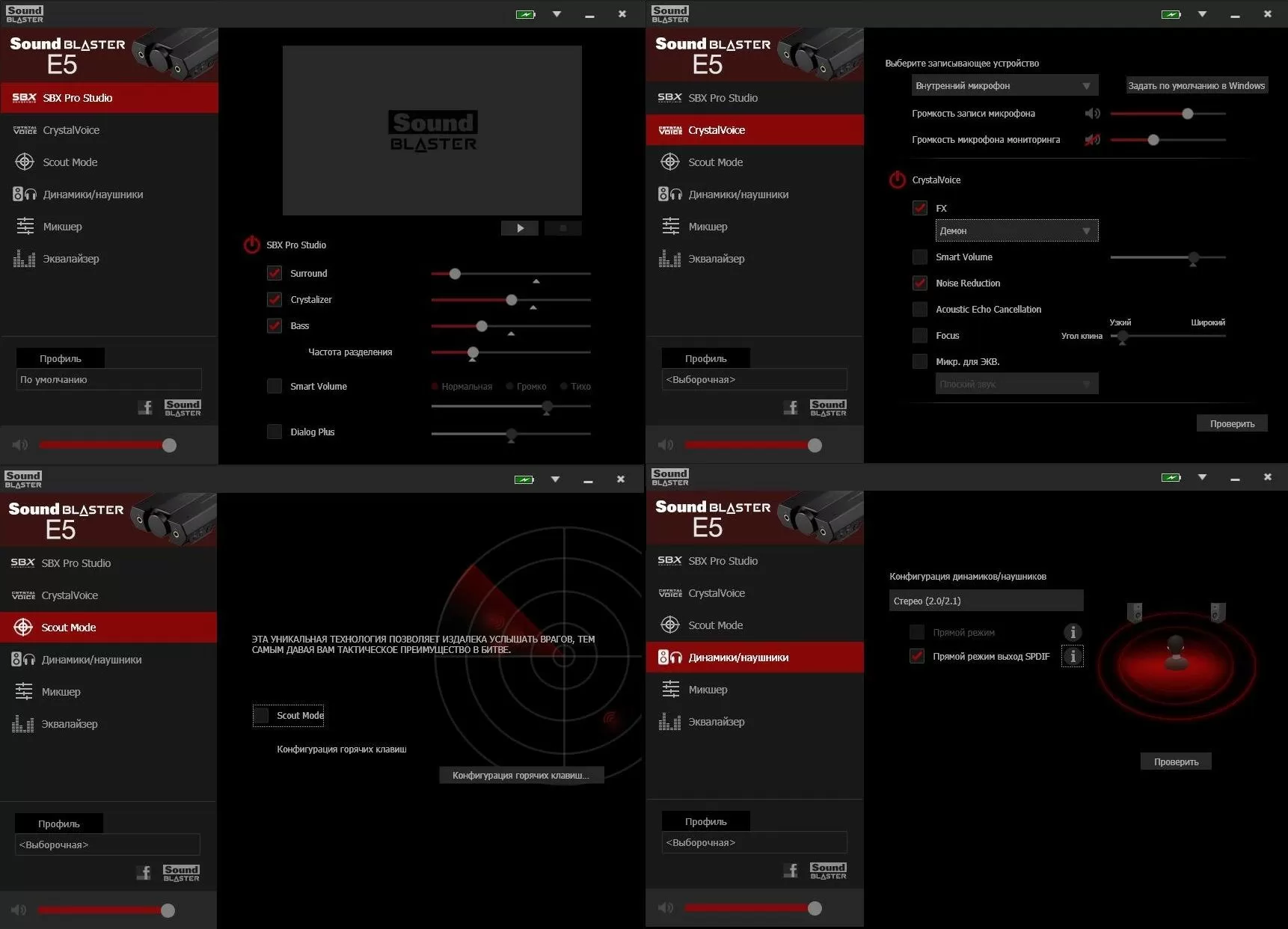 Из ключевых настроек мы отметим три. Первая – настройка фирменной технологии объёмного звука SBX Pro Studio, о которой мы уже говорили в обзоре геймерской гарнитуры Creative Sound BlasterX H5 и звуковой карты Creative Sound Blaster Play! 3. Эта технология придаёт звучанию объёмности и низких частот. Разница сравнима с контрастом в прослушивании музыки дома на обычных колонках и посещением кинотеатра. В видео-сравнении трёх звуковых карт разного ценового диапазона на нашем Youtube-канале мы продемонстрировали работу SBX Pro Studio. Если говорить коротко, то технология реально работает, по сути, не имея никаких негативных эффектов (шумы, искажения или взаимопроникновение каналов).