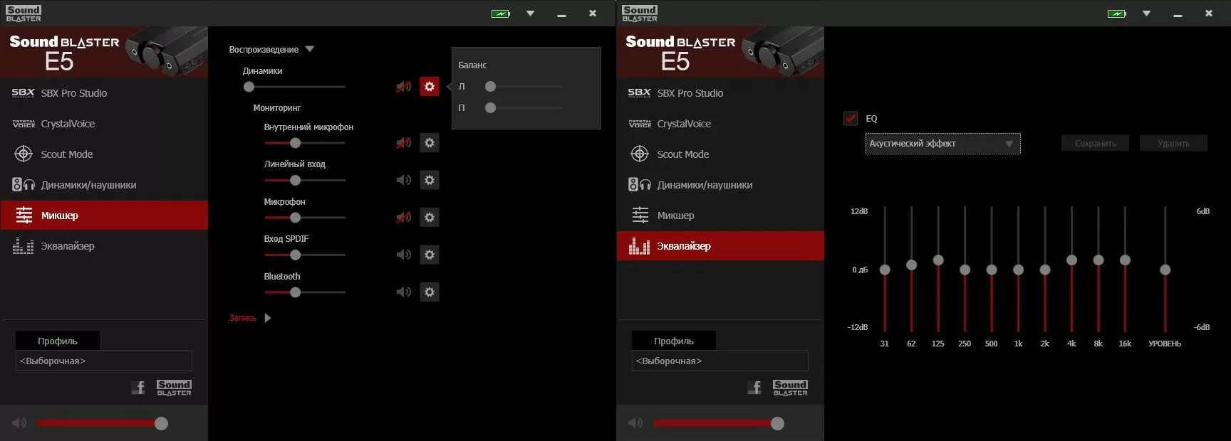 С помощью фирменных приложений Creative Sound Blaster E5 можно управлять и с компьютера и со смартфона. Все настройки хранятся во внутренней памяти, так что можно один раз настроить и пользоваться. Более того, есть поддержка профилей, так что при использовании аудио карты для разных целей можно создать соответствующие профили (например, профили для игр, для музыки и т.д.).