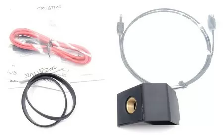 Под картой по пакетикам расфасован комплект, который состоит из: крепления на микрофонную стойку и по совместительству подставка для установки на горизонтальную поверхность, кабель microUSB весёлого красного цвета, оптический аудио-кабель, две резинки для крепления к аудио карте, например, смартфона, и немного макулатуры.