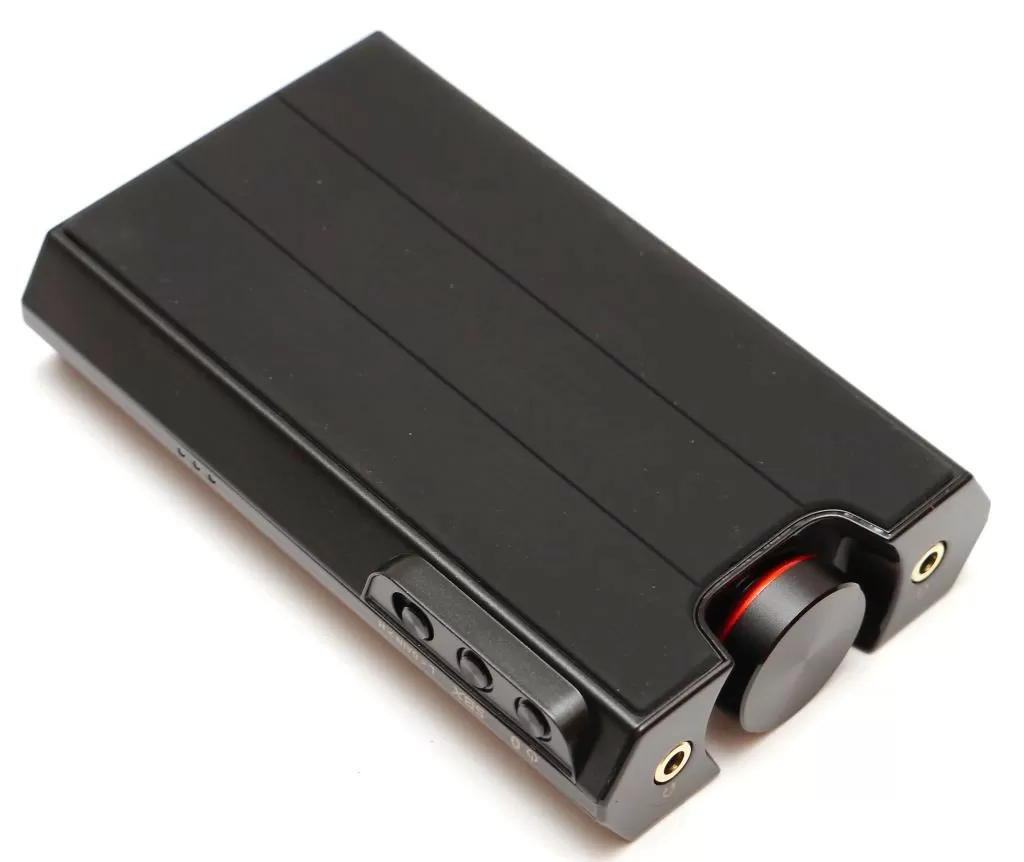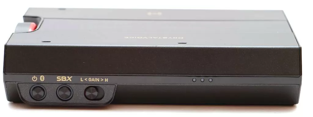 Справа на боку расположены кнопки управления: кнопка питания по совместительству отвечающая и за включение Bluetooth-модуля, кнопка активации технологии SBX Pro Studio, о которой мы поговорим чуть позже, а также переключатель усиления выходной мощности на наушники. Переключатель имеет две позиции: одна - для наушников от 16 до 120 Ом, вторая – от 120 до 600 Ом. В первом случае получаем усиление до 5 дБ, во втором – до 15 дБ. У кнопок также имеется светодиодная индикация режимов работы. А правее видны три белые точки – это индикатор ёмкости встроенного аккумулятора, ёмкость которого составляет внушительные 3200 мАч.