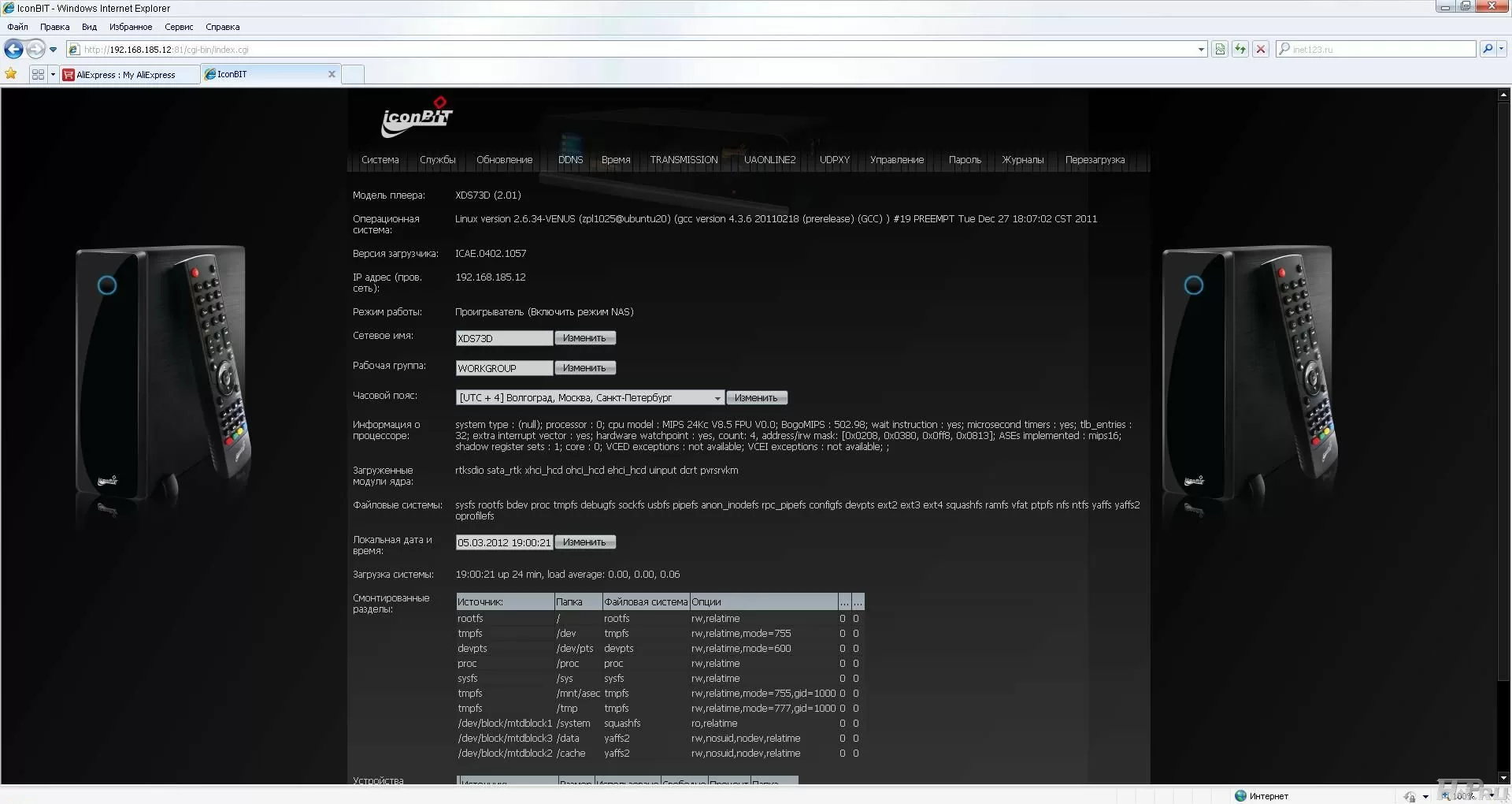 На первой странице можно посмотреть статус работы плеера, настроить сетевое имя и рабочую группу, настроить время и часовой пояс, а также посмотреть информацию о встроенной памяти и внешних накопителях.