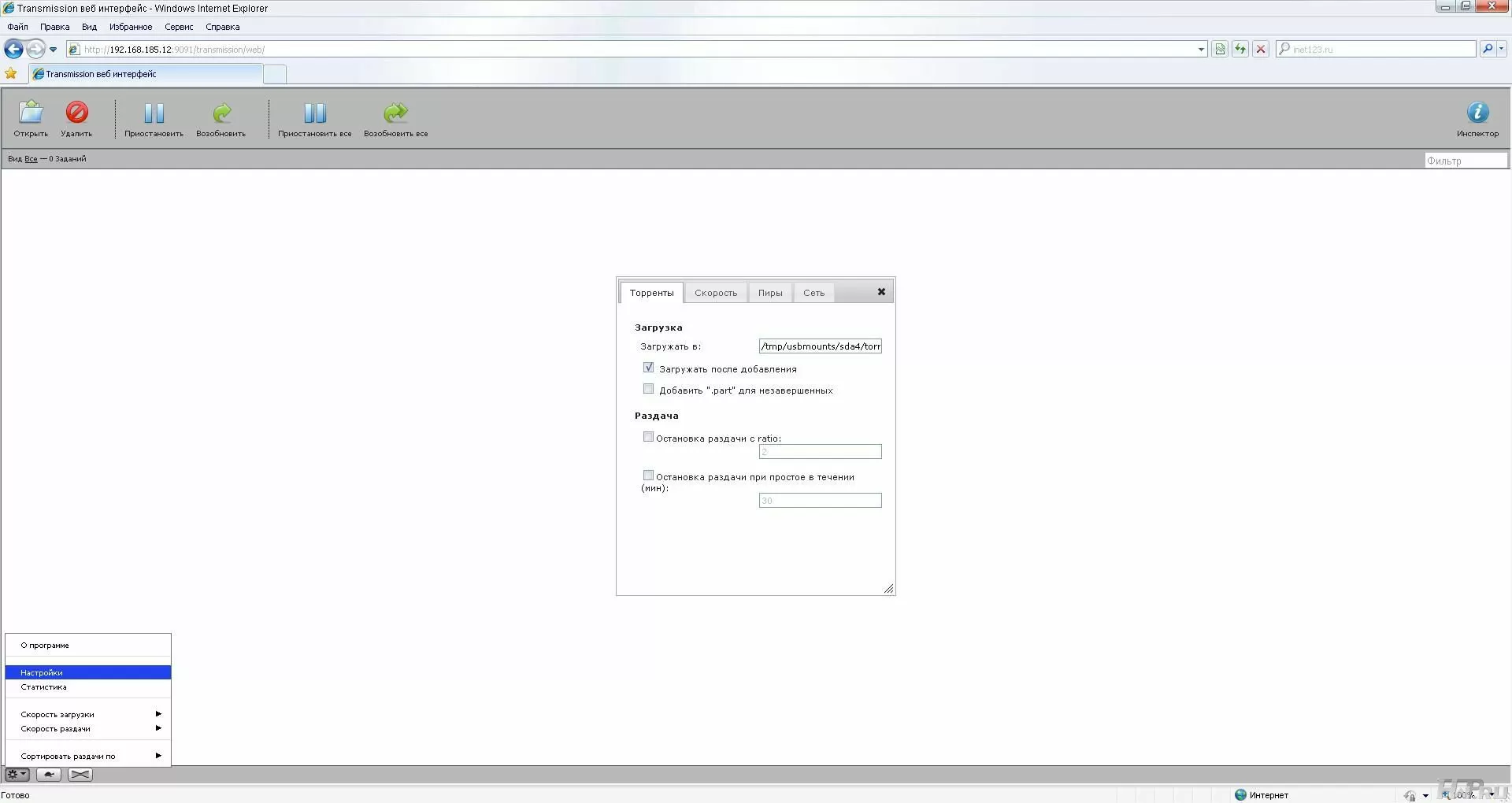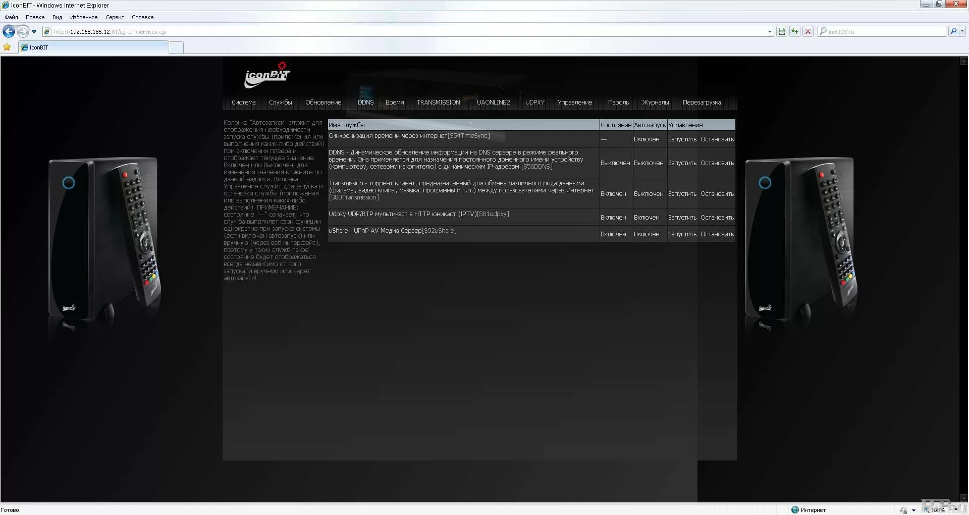 На второй странице осуществляется управление службами, их автозапуском. Для управления встроенной торрент-качалки необходимо перевести плеер в режим работы NAS на первой странице. После этого станет доступна страница "Transmission", на которую так же можно попасть, если зайти по порту 9091.