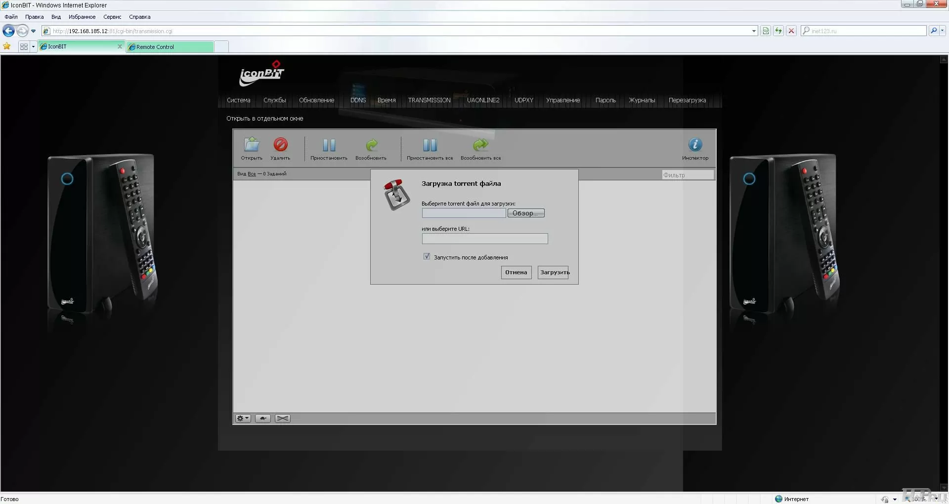 В случае, если надо быстро глянуть статус текущих закачек, можно воспользоваться пунктом меню "Transmission". А для удалённого администрирования закачек можно воспользоваться веб-интерфейсом плеера, основные настройки доступны по 81 порту по адресу плеера, разумеется.
