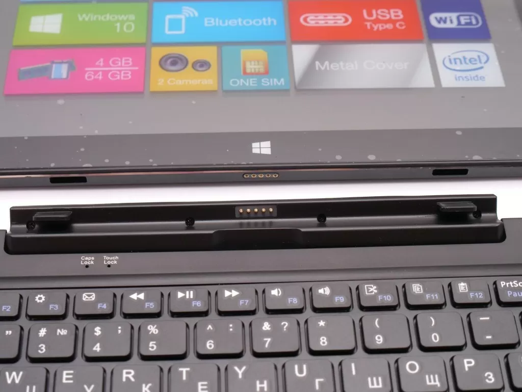 Соединяется планшет с клавиатурой с помощью традиционного решения (если кто не в курсе - то этот разъединяющийся разъём ни что иное, как USB), а надежная фиксация осуществляется большими выступами и магнитами. Поворотный механизм достаточно жесткий, так что самостоятельно угол наклона не поменяется - приходится прилагать достаточные усилия.