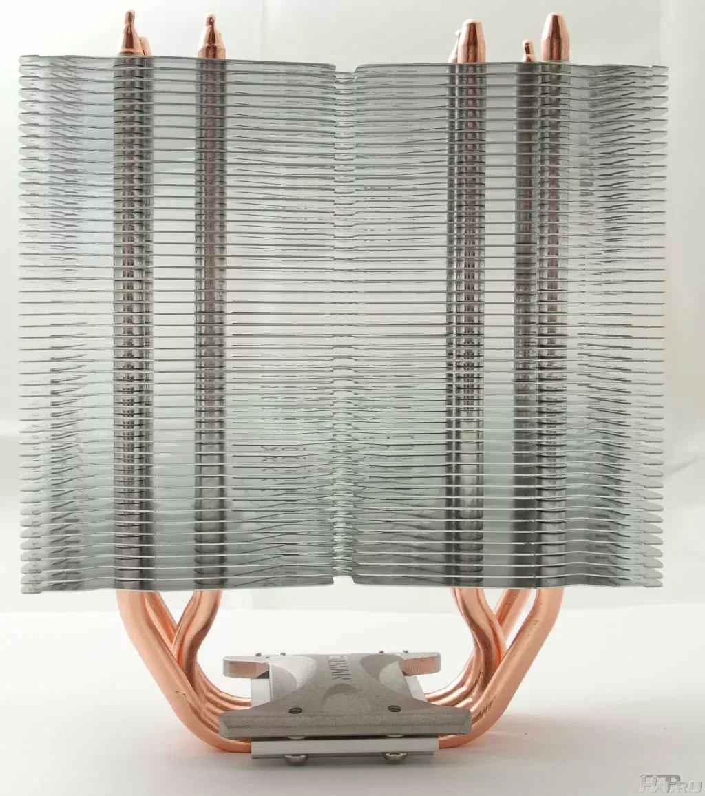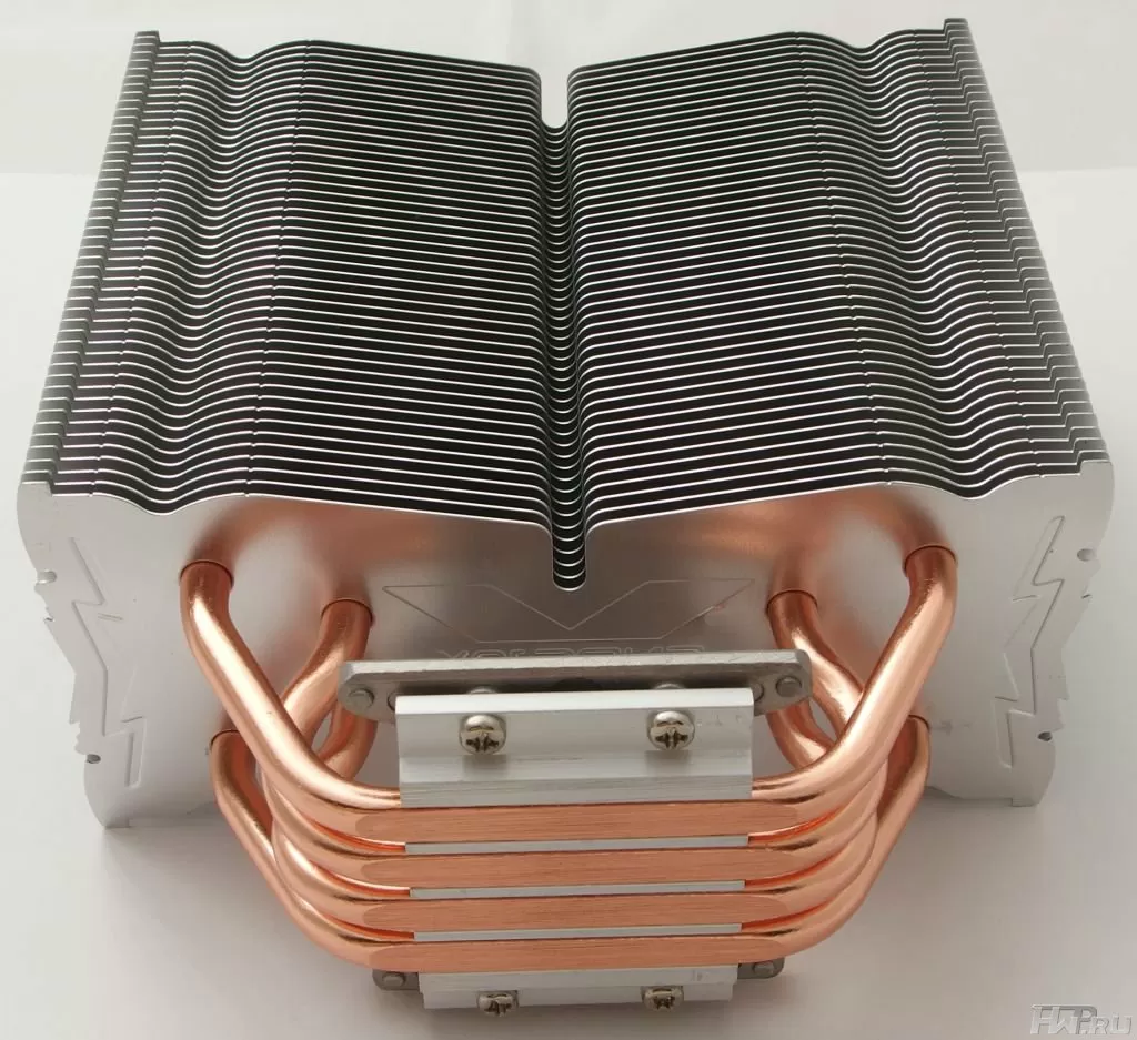 В данной модели производитель выбрал вариант с непосредственным контактом трубок с процессором. Хоть он и имеет некоторые недостатки, в частности - воздушные "коридоры" между трубкой и основанием в местах примыкания к крышки процессора. На фотографии они отчётливо видны. С другой стороны - чем меньше посредников и переходов между разными материалами (основание и рёбра - алюминий, трубки - медь), тем эффективность передачи тепла выше.