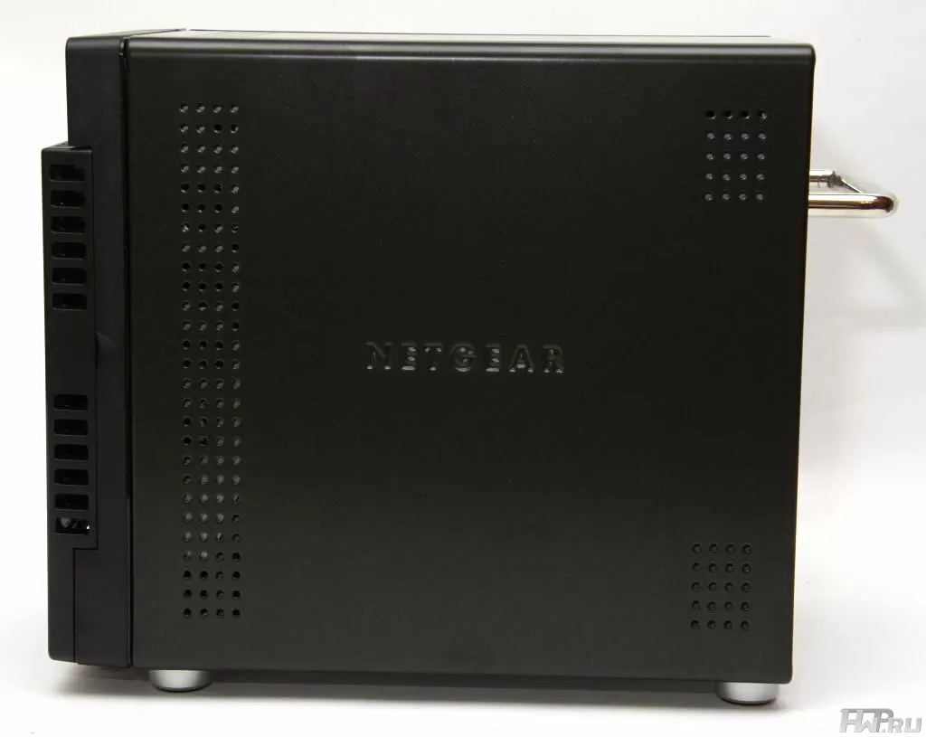 В плане дизайна NETGEAR RN10400 вызывает интерес. Несмотря на огромное разнообразие сетевых хранилищ на рынках, дизайнеры умудряются каждому устройству дать своё "лицо". Хотя в большинстве своём это монолитные чёрные "кубики" (или "гробики") в стиле barebone систем, и в целом если над корпусом особо и не поколдуешь, то над дизайном лицевой панели грех не поработать.