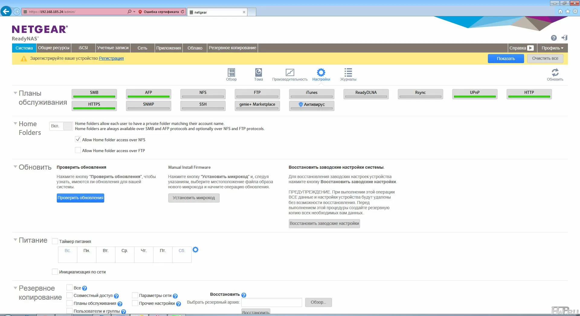 На странице "Настройки" можно задействовать различные встроенные сервисы: SMB, FTP, SNMP и так далее. Присутствует даже поддержка iTunes, ReadyDLNA и встроенный антивирус. Также можно вручную обновить прошивку NAS, восстановить заводские настройки. Имеется поддержка работы хранилища по расписанию - отличное решение для офисов, которые работают не круглосуточно. Можно настроить автоматическое выключение в нерабочее время. Конечно, если не настроить на это время резервирование или автоматическую проверку на вирусы.