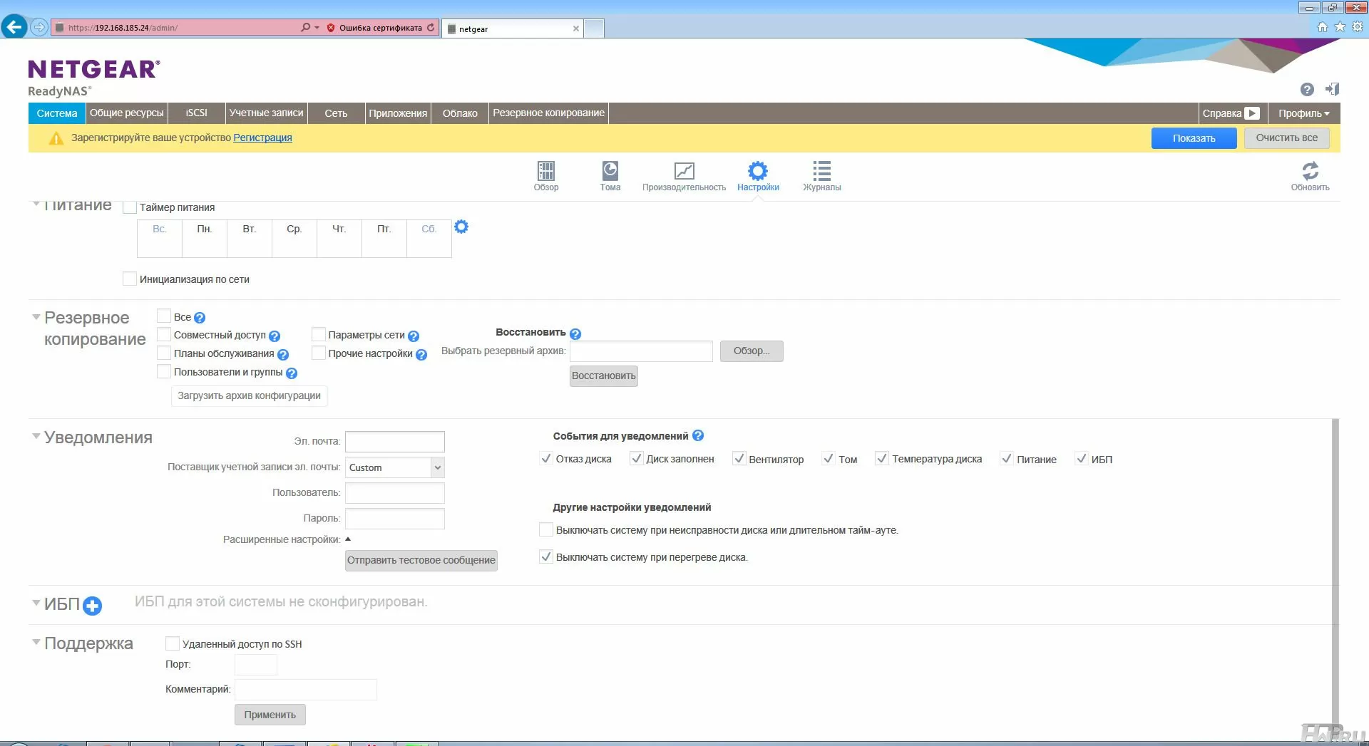 Что интересно - можно сохранить текущую конфигурацию (причём как полностью, так и частично, например, информацию о пользователях и доступе), и восстанавливать её в случае неправильной настройки. Тут же можно настроить уведомления по электронной почте о разных событиях, например, выходе из строя жесткого диска или вентилятора.