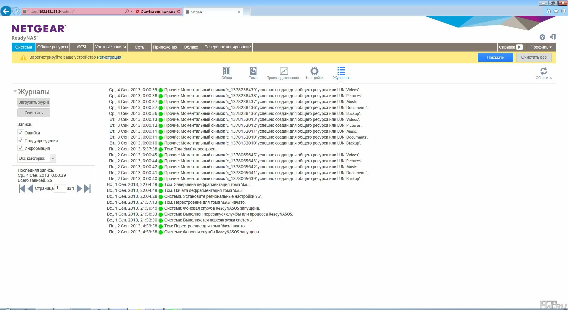 На следующей странице отображается журнал событий, в котором логируются события, ошибки и прочая информация.