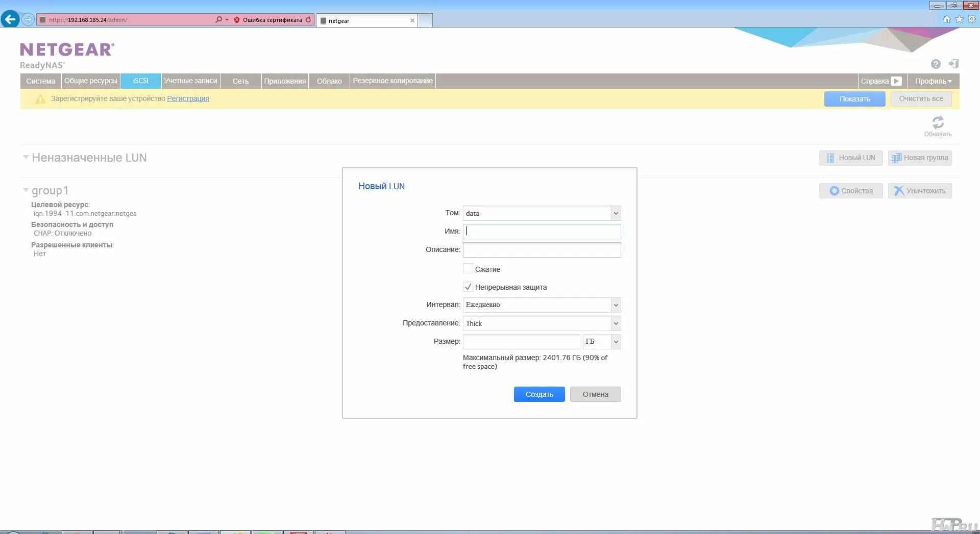 Название пункта меню iSCSI говорит само за себя - тут можно создать iSCSI раздел, для использования NAS в качестве внешнего накопителя для сервера и/или компьютеров пользователей.