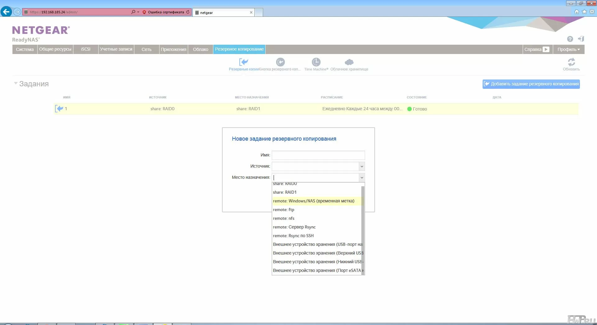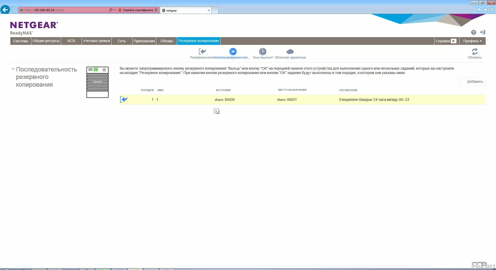 Резервному копированию отведен последний пункт меню. Тут можно настроить сколь угодно заданий, будь-то backup со встроенных жестких дисков на сервер Rsync, FTP или NFS ресурс и т.д. Вариаций куча.