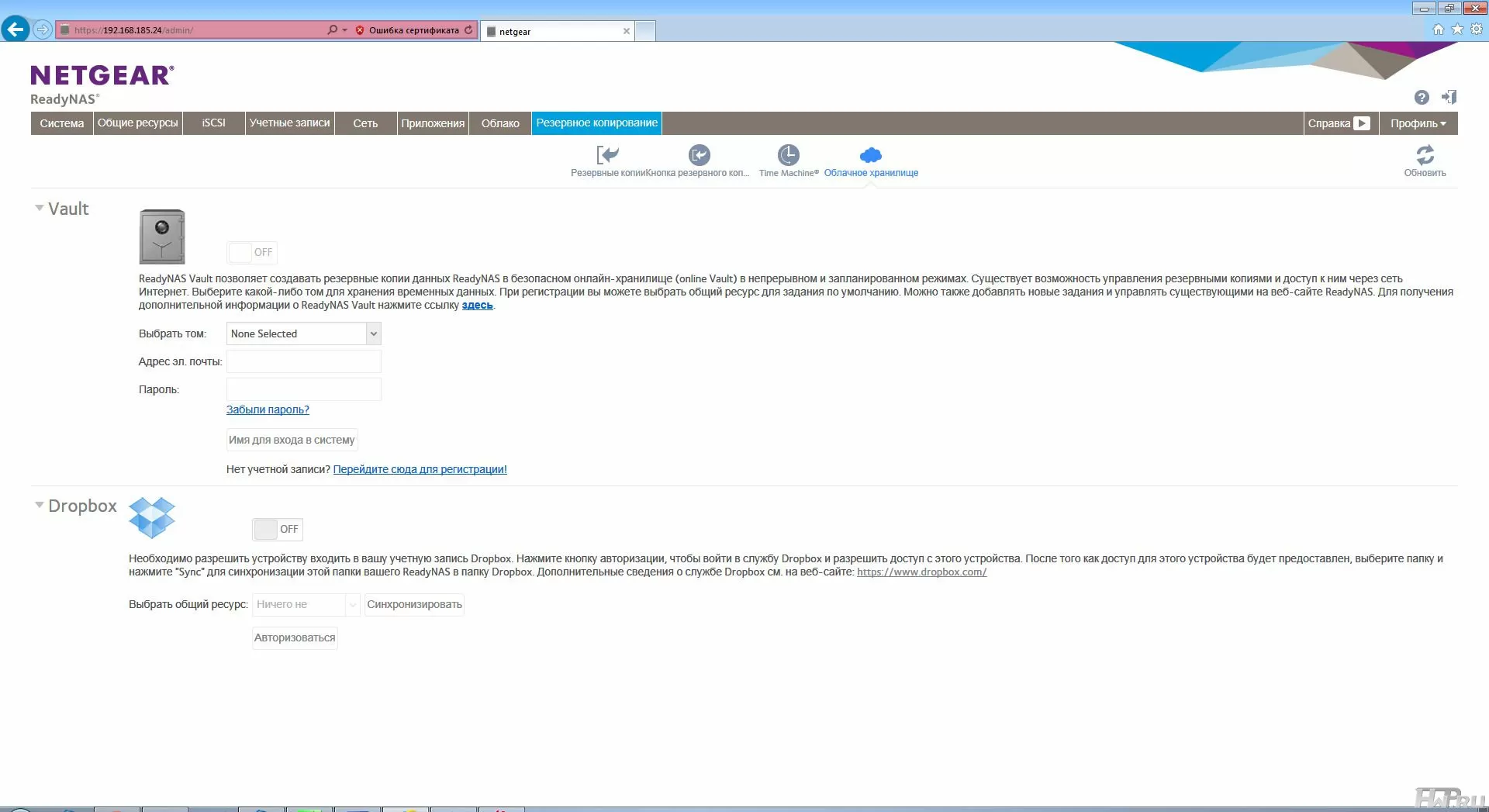Пользователи техники Apple будут приятно удивлены наличием поддержки сервиса Time Machine. Но есть и другие доступные облака - фирменный ReadyNAS Vault и известный многим Dropbox. Не будем заострять на них внимание, а перейдём уже наконец к тестированию производительности.