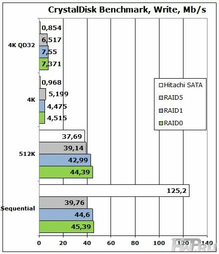 Результаты CrystalDisk Benchmark ещё более плотные. Разницу в результатах вообще можно списать на погрешность, но в целом тенденции всё те же - RAID 5 чуть быстрее по чтению, RAID 0 - чуть быстрее по записи.