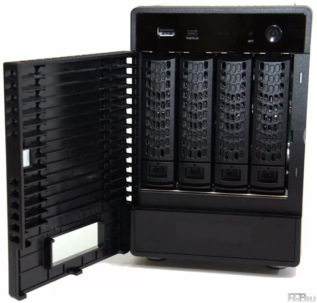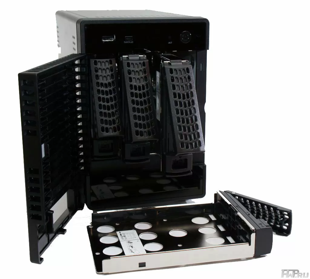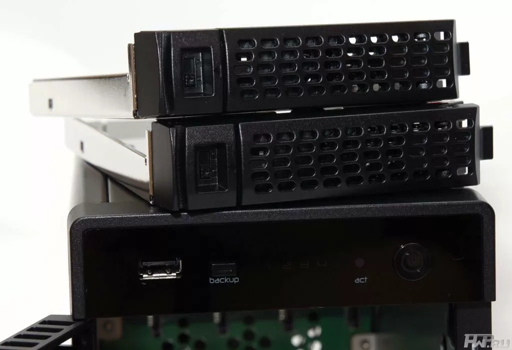 Над дверцей расположены индикаторы статусов жестких дисков и активности системы, USB порт и кнопка Backup для быстрого копирования информации с флеш-накопителя, а также кнопка питания.