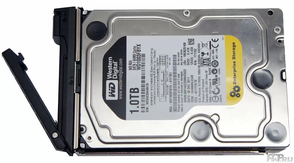 Для тестирования мы использовали жесткие диски Western Digital Black серии Raid Edition 4 объёмом 1 ТБ. Сегодня это наиболее оптимальный вариант HDD для использования в корпоративных NAS-ах. Во-первых, благодаря оптимизации прошивки для RAID, эти HDD не выпадают из массивов при ошибках носителя, то есть бэд блоках. Во-вторых, за годы существования, эта серия доказала свою надежность. В-третьих, они находятся в списке совместимости всех СХД под 3.5-дюймовые диски (не считая HP, Dell, IBM, признающих только HDD со своими наклеечками). Ну и не в последнюю очередь, они достаточно быстры и при этом цена на них сопоставима с обычными жесткими дисками для настольных ПК.