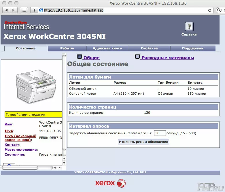 Дизайном Web-интерфейс не блещет, но что гораздо важнее - он полностью переведен на русский язык. Так что без труда вы сможете настроить параметры печати, энергосбережения, настроить адресную книжку и выбрать нужные сетевые параметры. А начать рекомендуем с того, чтобы выделить для Xerox WorkCentre 3045NI статический IP-адрес в вашей сети.