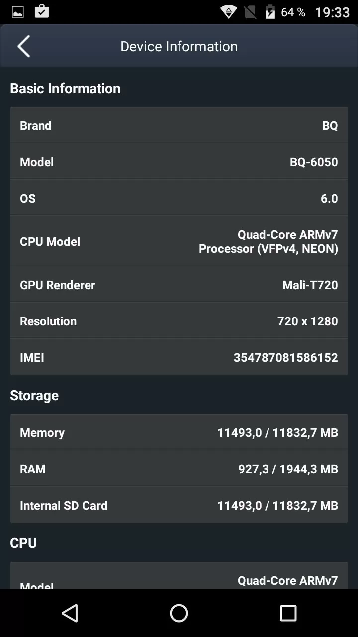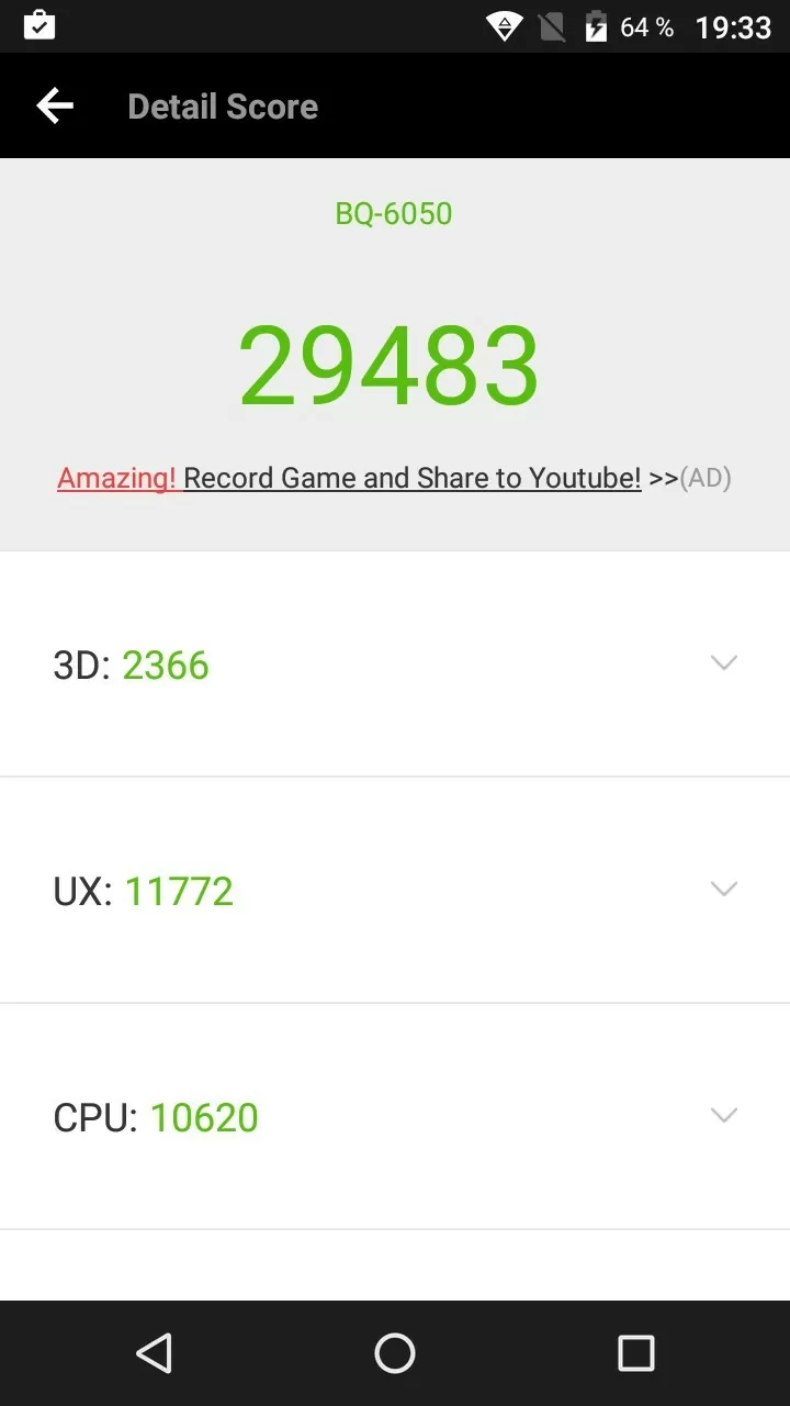 По "железу" всё вполне неплохо, как для бюджетного фаблета. Оперативной памяти - 2 Гб, постоянной - 16 Гб (пользователю доступно около 11 Гб). Процессор - известный нам по предыдущим обзорам смартфонов BQ MTK6737 с четырьмя ядрами. Это бюджетный процессор, главными достоинствами которого является неплохая производительность, поддержка 4G и VoLTE (передача голоса по 4G). Эта связка демонстрирует неплохой результат в 29 тысяч попугаев в бенчмарке AnTuTu Benchmark.