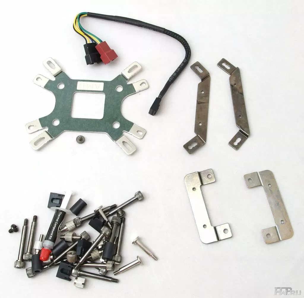Обилие элементов крепежа не должно смущать - всё предельно просто. Вентиляторы к радиатору крепятся с помощью длинных болтов. Всего их 12 штук - восемь обычных, и четыре длинных - для крепления вентилятора к радиатору через корпус ("бутерброд" вида корпус-вентилятор-радиатор). Для установки радиатора напрямую к корпусу в комплекте имеются четыре соответствующих маленьких болтика. Все остальные элементы служат непосредственно для крепления водоблока к процессорному сокету.