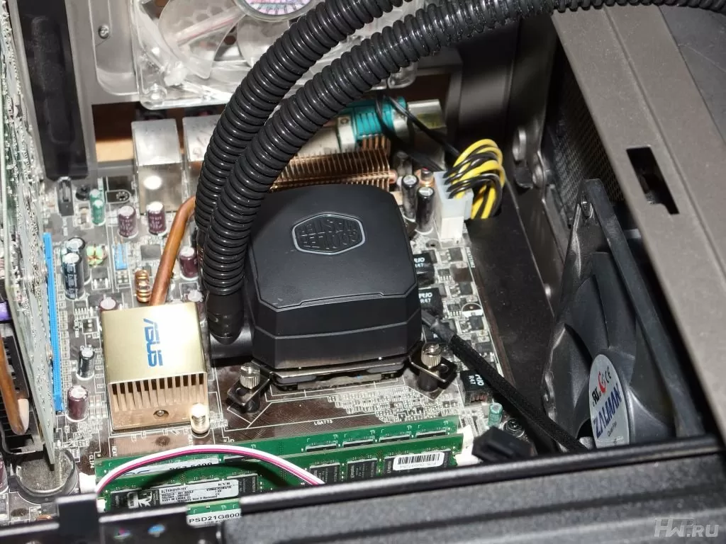 Но есть и некоторые особенности. Главная проблема установки данной СВО - необходимость размещения радиатора внутри корпуса. Безусловно, в абы-какой корпус Nepton 140XL не влезет. Одно из главных требований - наличие посадочного места под 120 мм (а в идеале - под 140 мм) вентилятор рядом с процессором. И не обязательно оно должно быть на задней части корпуса - подойдёт и посадочное место наверху, на крышке корпуса. К слову, многие современные бюджетные модели корпусов имеют идеально подходящее (т.е. 140 мм) посадочное место именно сверху. Правда, и в этом случае нужно быть внимательным, так как в зависимости от материнской платы, бутерброд из радиатора и одно вентилятора общей толщиною в 63 мм может просто не уместиться между корпусом и водоблоком.