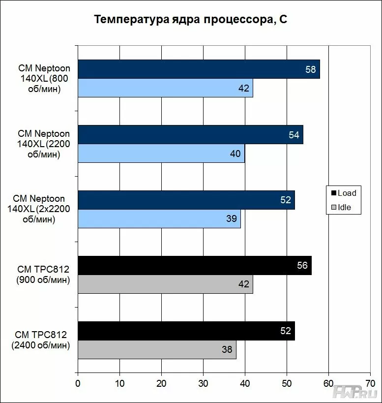 Несмотря на то, что наш тестовый процессор трудится у нас не первый год, его тепловой пакет составляет значительные 105 Вт, как и у современных высокопроизводительных многоядерных CPU. Так что никаких послаблений участникам мы не даём. Стопроцентную нагрузку на процессор обеспечивает утилита OCCT, которую мы запускаем на 10 минут. А в качестве конкурента выступает наша тестовая "башня" Cooler Master TPC 812.