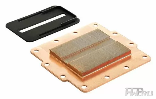 Внутреннее устройство водоблока продемонстрировано на фотографии ниже. По понятным причинам, фотография не наша и позаимствована у производителя. Обратите внимание - использована исключительно медь, а основание имеет большое количество плотно посаженных ребер, как у воздушных радиаторов, для передачи тепла хладагенту. Очень хочется проверить, насколько необходимы эти ребра, ведь жидкость - не воздух, и свободно проходить сквозь такую преграду она не может, но разбирать водоблок не входит в наши планы.