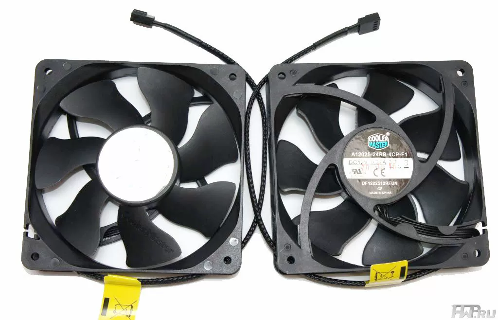 Продувать такую конструкцию - задача не из лёгких. В комплекте идут два вентилятора Cooler Master A12025-24RB-4CP-F1. В них применяется подшипник скольжения с винтовой нарезкой. Подключение - 4pin с PWM. Обороты регулируются в пределах 600-2400 об/мин, при этом уровень шума составляет 19-40 дБ соответственно. Модель вентилятора проверенная, и устанавливается, кстати говоря, на Cooler Master TPC 812, который на тестировании у нас будет выступать в качестве конкурента.