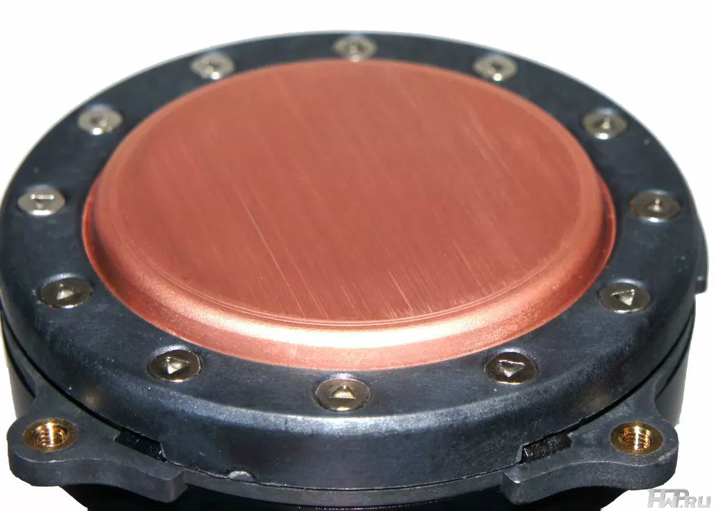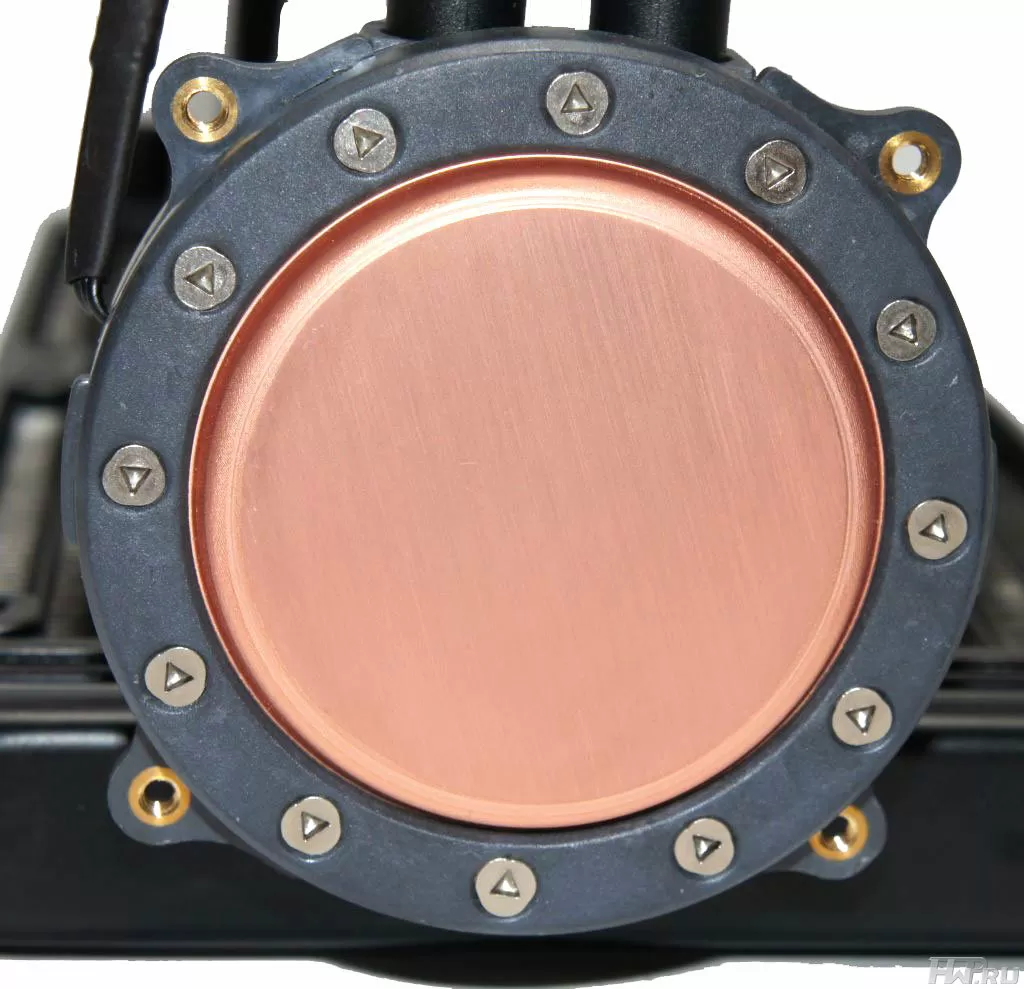 Основание ровное, отполировано неплохо, но не до зеркального состояния. Интересно, что основание крепится 12-ю болтиками с очень редким 3-угольным шлицом. Едва ли вам потребуется когда-нибудь откручивать их, ведь даже помпа здесь не подлежит замене. Правда, по утверждению производителя, её срок службы в полтора раза превышает срок службы вентилятора.