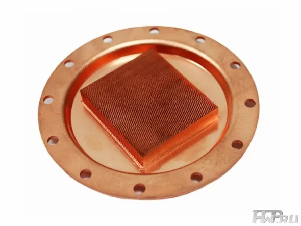 Основание выполнено из меди. На сайте производителя есть фотография внутренностей водоблока (по вполне понятным причинам мы разборкой заниматься не стали).