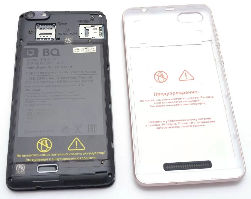 Под съёмной крышкой прячутся два слота для SIM карт формата нано и микро, слот для microSD карточки, а также несъёмный аккумулятор на 5000Ач, что позволило сохранить вполне компактные размеры устройства (с учётом ёмкости, конечно же) - 145х73х10,5 мм, вес же составляет 187 г.