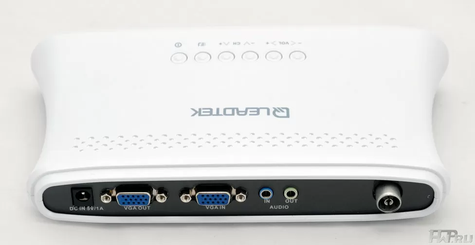 Белый корпус продукта имеет необычную обтекаемую форму сплющенного колокола – плавную, но будто «обрубленную» спереди и сзади. На «срезах» располагаются аудио- и видеовходы и выходы. Обратите внимание, что VGA IN и VGA Out имеют стандартные разъёмы D-SUB, что позволяет использовать ваши кабели. Некоторые тюнеры вместо VGA-IN имеют порт DB9, и если вы захотите использовать более длинный кабель, вам придётся искать в продаже редкий переходник. Лицевая и тыльная стороны тюнера закрыты непрозрачными темными акриловыми вставками, изящно контрастирующими с белизной остальной части корпуса устройства.