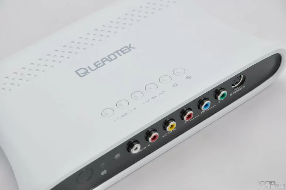 Если положить тюнер на «брюхо», сверху заметен набор кнопок, отвечающих за его включение, вход в меню, навигацию по нему, регулировку громкости и переключение каналов. На лицевой стороне располагаются низкочастотные видеовходы: композитный, компонентный (Y, Pb, Pr), стереофонический аудио-вход (те же «тюльпаны»), «окошко» ИК-приемника для пульта дистанционного управления, светодиодный индикатор питания и вышеупомянутый датчик освещенности. К компонентному видеовходу, кстати, без проблем можно подключить игровые приставки вроде XBOX 360, PlayStation 3 и Wii.