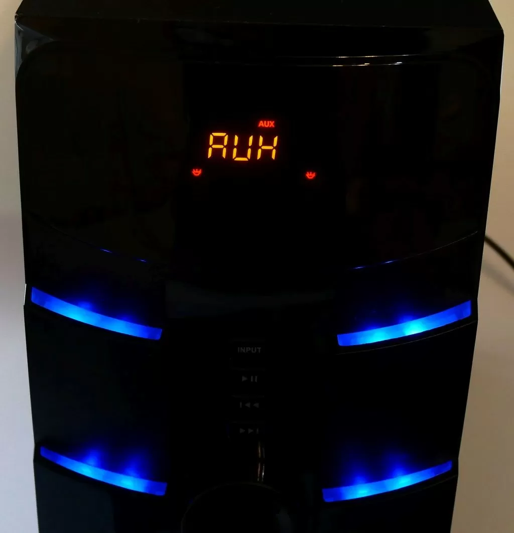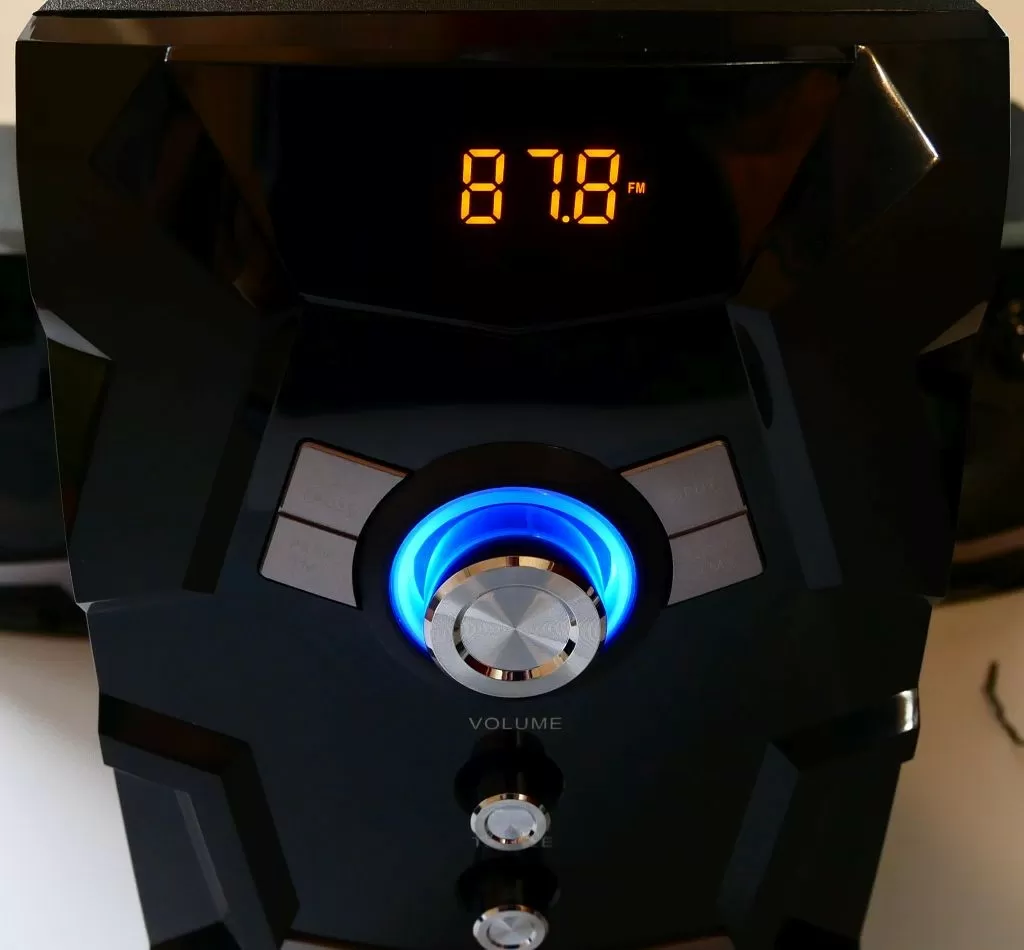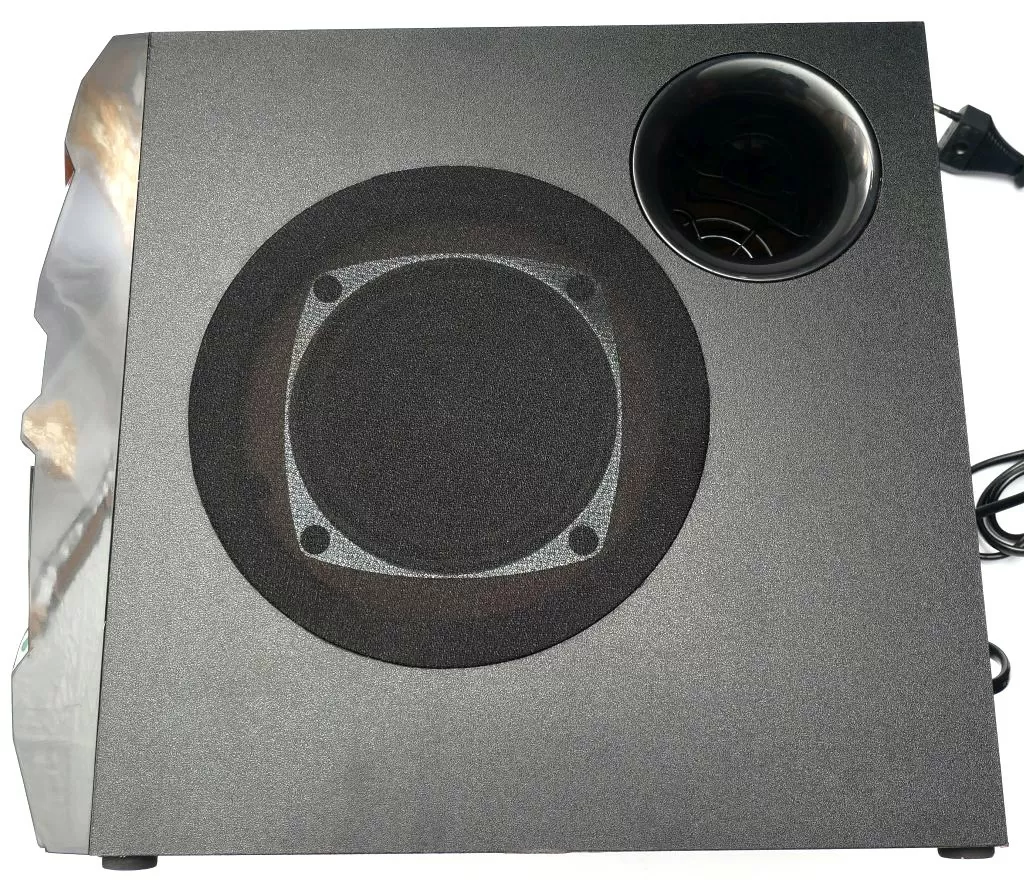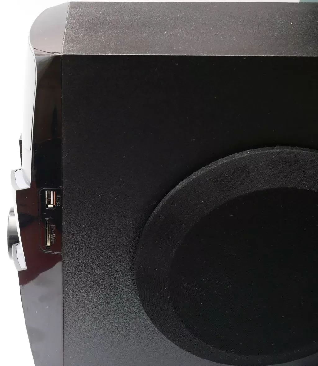 На передней панели сабвуфера находятся основные органы управления – аналоговый регулятор громкости, кнопки переключения треков, а также кнопка переключения источника звука. На верхнем торце передней панели находятся порт USB и слот для карточек формата SD. По бокам сабвуфера находятся НЧ динамик и порт фазоинвертора, а сзади сабвуфера находится раздвижная ФМ-антенна, тумблер питания, регулятор баса и набор RCA: аудиовход и выходы для подключения сателлитов.