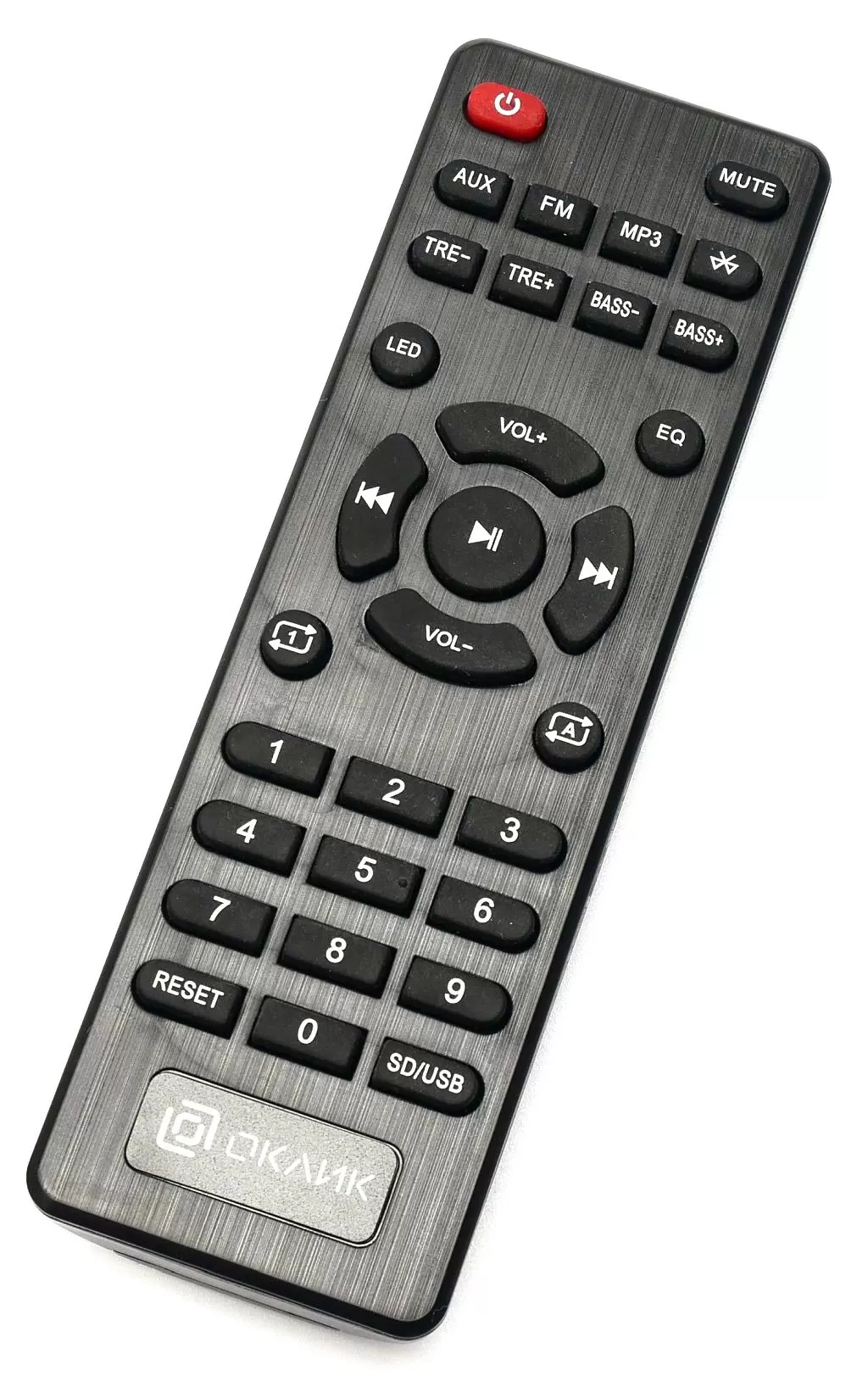 Порт USB и слот для SD карточек находится на правом торце лицевой панели. Сзади на корпусе находятся аудиопорты, тумблер питания и выдвижная ФМ-антенна. В комплекте идёт пульт ДУ, выглядит он уже посерьёзнее, чем у OK-430.