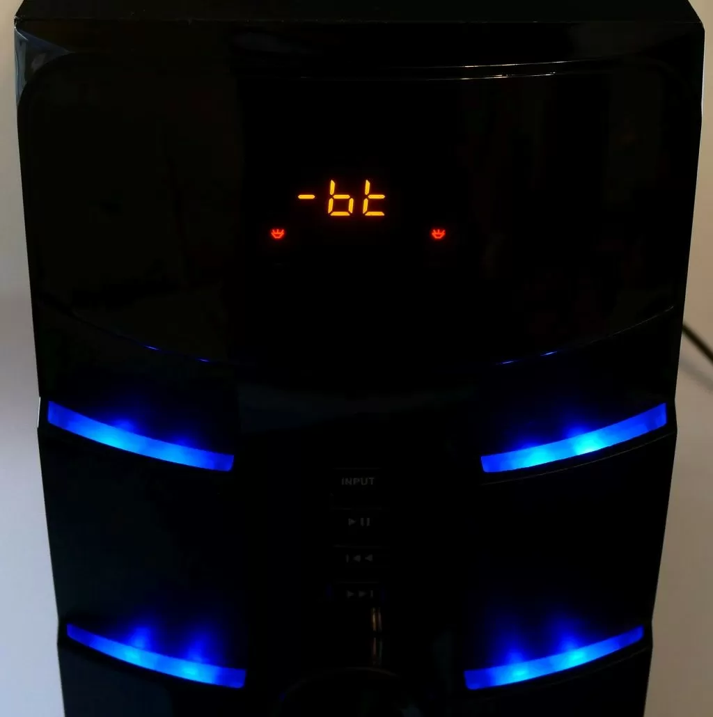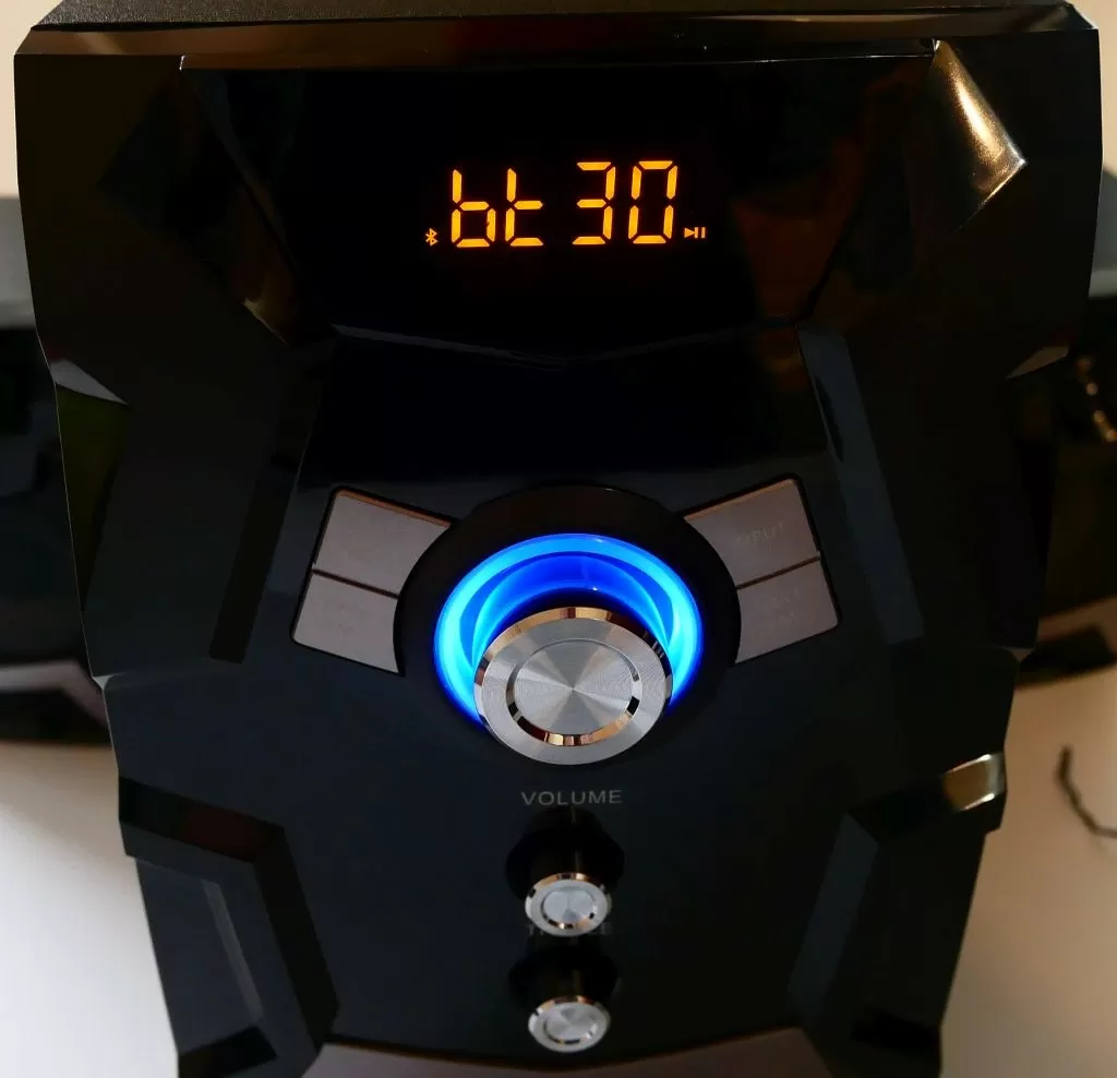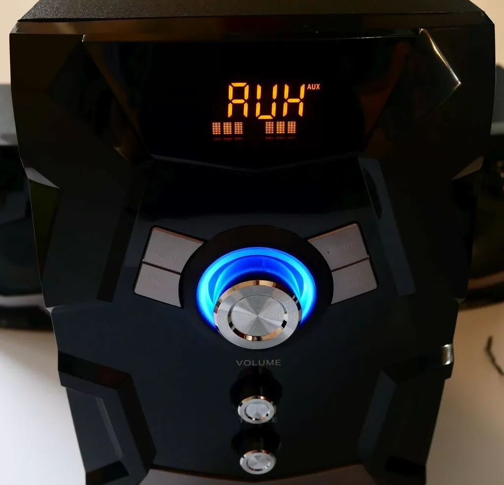 Как мы уже говорили выше, все три модели имеют одинаковый функционал: помимо аудиовхода есть возможность подключить АС по Bluetooth, также есть возможность воспроизведения музыки с USB флешек и SD карточек, или же можно послушать ФМ-радио. Удобства управления добавляет небольшой дисплей на передней панели сабвуфера, а также комплектный пульт управления, который у данной модели совсем простенький, но всё же лучше такой, чем никакой.