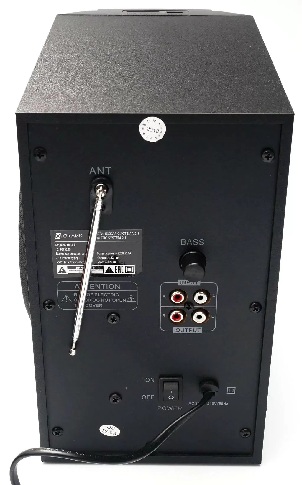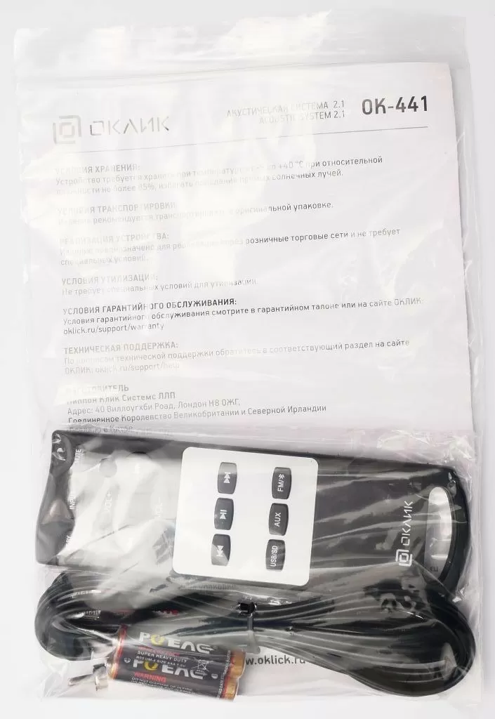 Любопытно, что НЧ динамик (к слову, 100 мм в диаметре) и порт фазоинвертора находятся на одной стороне корпуса. Сзади набор разъёмов и кнопок такой же, как у Oklick OK-440. В комплекте также идёт пульт управления, правда, количество кнопок заметно меньше, чем у пульта Oklick OK-440.