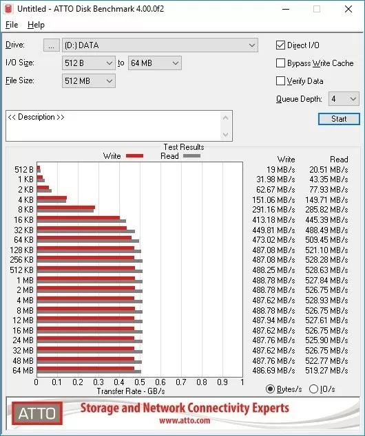 Гораздо важнее для любого пользователя SSD – это аппаратная начинка и скоростные показатели. В PNY CS900 используется TLC память и контроллер – производства Phison, модель PS3111-S11. Для тестирования мы по традиции использовали две программы – ATTO Disk Benchmark и CrystalDiskMark, которые замеряют скорости чтения и записи разными методами, используя блоки разных размеров.